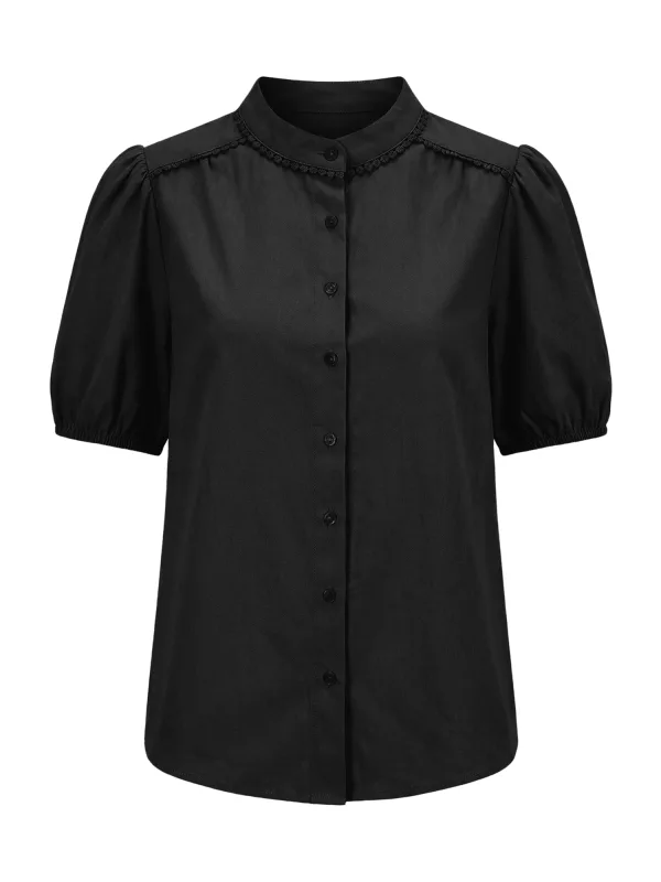 Blouse type: Klassieke blouse; Design: Gevoerde zoom/rand; Type sluiting: Knoopsluiting; Materiaal: Katoen; Motief: Effen; Kraag: Opstaande kraag; Details: Kant, Gedrapeerd; Extra's: Op staal naden; Pasvorm: Normale pasvorm; Armlengte: Halve mouw; Lengte: Normale lengte