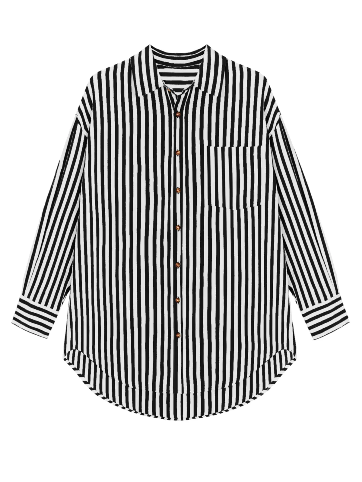 Blouse type: Klassieke blouse; Design: Ronde zoom, Overcut schouder, Borstzak; Type sluiting: Knoopsluiting; Materiaal: Katoen; Motief: Gestreept; Kraag: Kentkraag; Details: Plooien; Extra's: All-over patroon; Pasvorm: Wijde pasvorm; Armlengte: Lange mouw; Lengte: Lange pasvorm