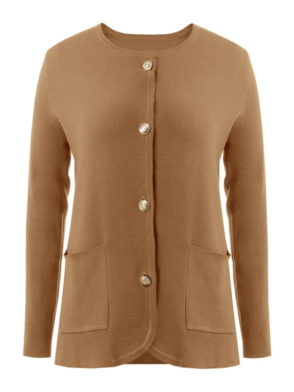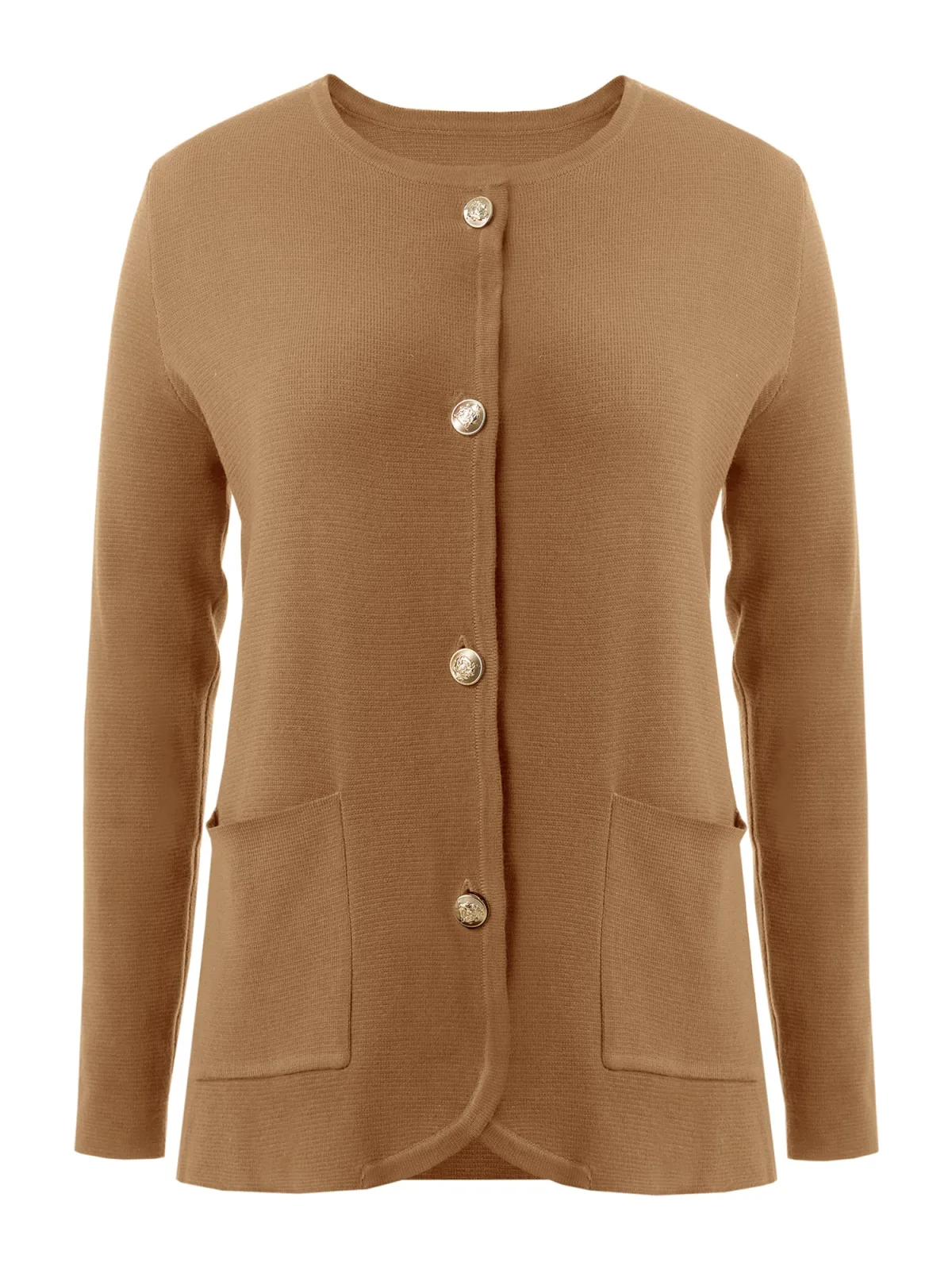 Design: Geribbelde kraag, Geribd ceintuurtje; Type sluiting: Knoopsluiting; Materiaal: Knitwear; Halstype: Ronde hals; Motief: Effen; Extra's: Fully fashioned; Pasvorm: Normale pasvorm; Armlengte: Lange mouw; Lengte: Normale lengte