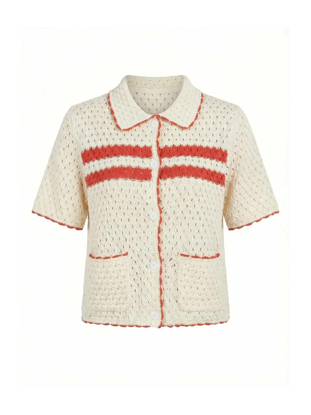 Design: Opgezette zakken; Type sluiting: Knoopsluiting; Materiaal: Knitwear; Halstype: Polokraag; Motief: Gestreept; Details: Mesh; Extra's: Met textuur; Pasvorm: Normale pasvorm; Armlengte: Halve mouw; Lengte: Normale lengte