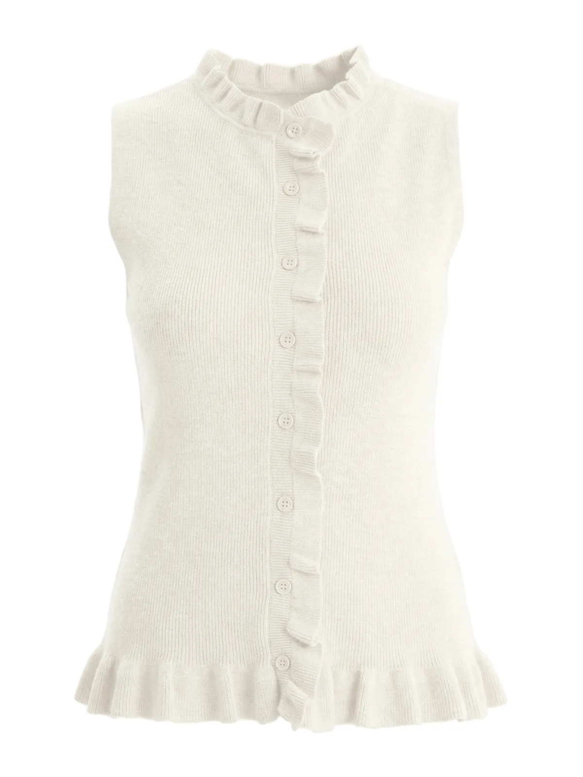 Design: Knop placket; Type sluiting: Knoopsluiting; Materiaal: Knitwear; Halstype: Opstaande kraag; Motief: Effen; Details: Ruches; Extra's: Met textuur; Pasvorm: Slanke pasvorm; Armlengte: Mouwloos; Lengte: Normale lengte