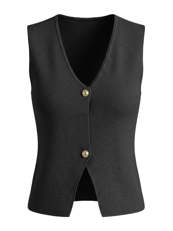 Design: Geribbelde kraag; Type sluiting: Knoopsluiting; Materiaal: Knitwear; Halstype: V-hals; Motief: Effen; Extra's: Voelt zacht aan; Pasvorm: Slanke pasvorm; Armlengte: Mouwloos; Lengte: Normale lengte