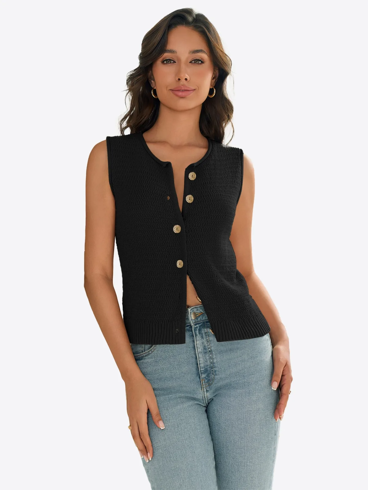 Design: Knop placket; Type sluiting: Knoopsluiting; Voering: Niet gevoerd; Materiaal: Knitwear; Halstype: Ronde hals; Motief: Effen; Extra's: Fully fashioned; Pasvorm: Slanke pasvorm; Armlengte: Mouwloos; Lengte: Normale lengte