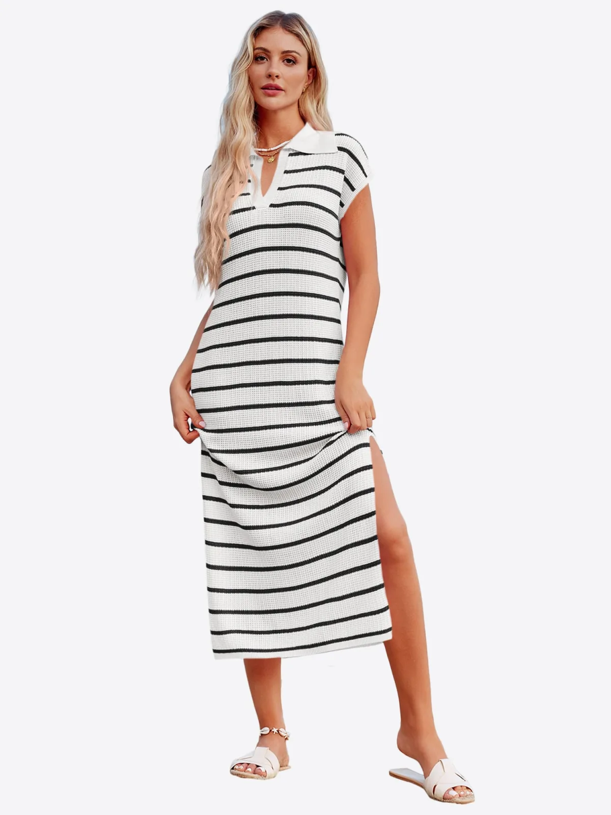 Design: Geribd ceintuurtje; Materiaal: Knitwear; Halstype: Polokraag; Motief: Gestreept; Details: Mesh; Extra's: All-over patroon; Lengte: 7/8 lengte; Snit: Recht; Pasvorm: Normale pasvorm; Armlengte: Kwartmouw