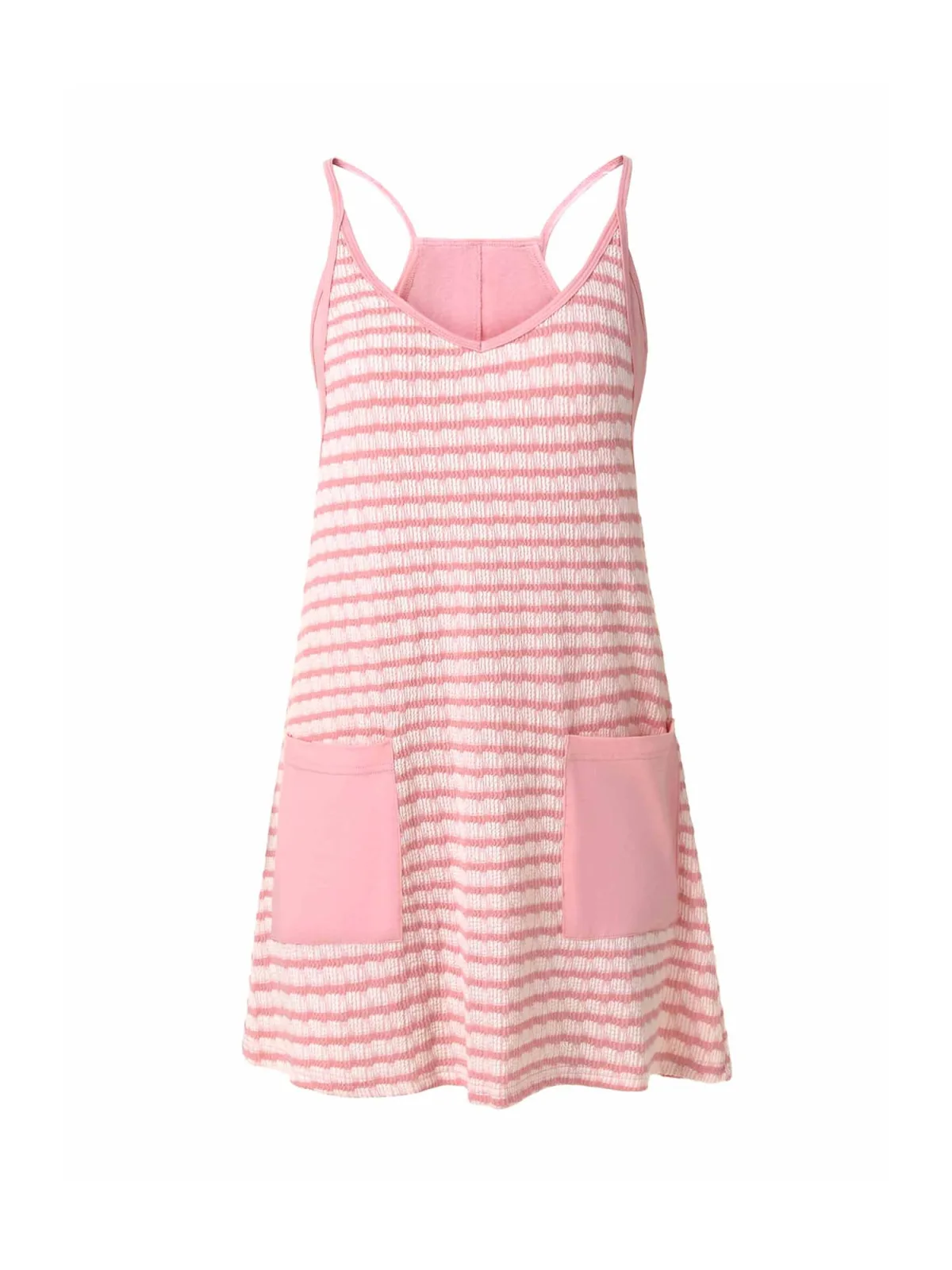 Design: Opgezette zakken; Halstype: V-hals; Motief: Gestreept; Soort bandjes: Spaghettibandjes; Extra's: All-over patroon; Lengte: Kort/mini; Pasvorm: Normale pasvorm; Armlengte: Mouwloos