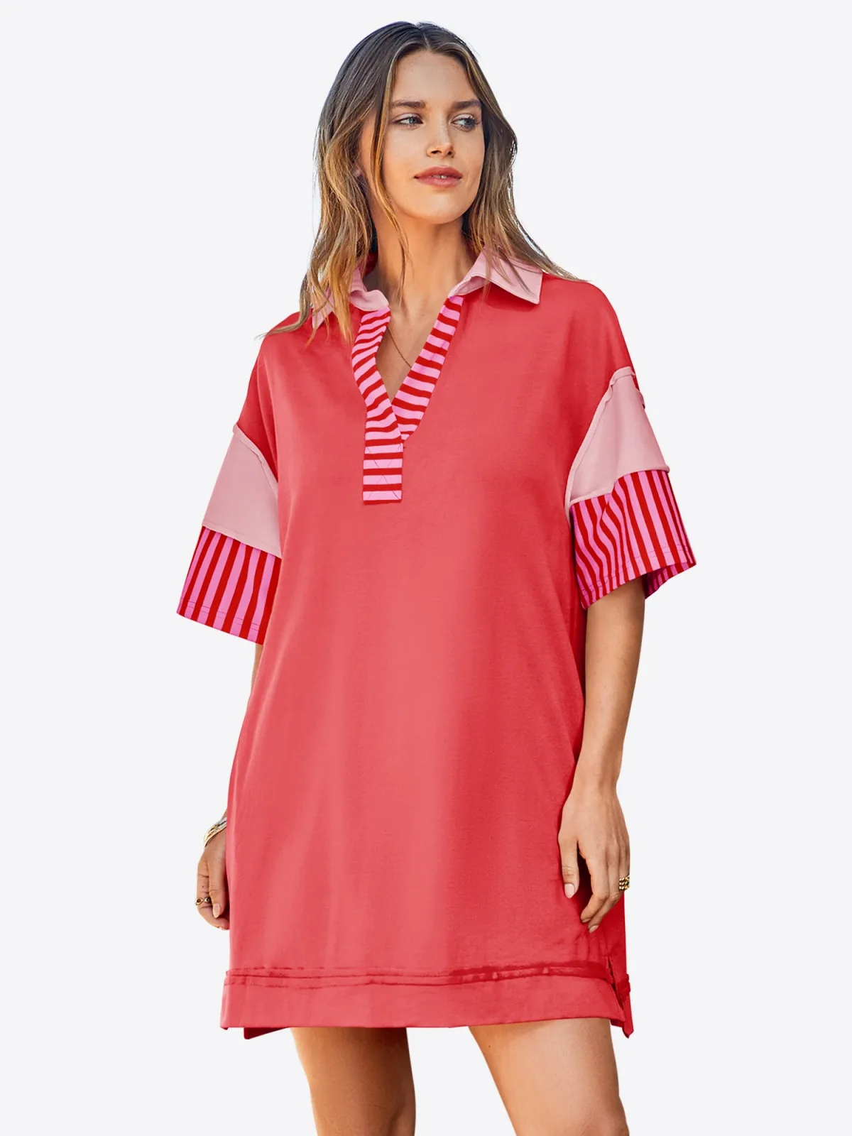 Design: Rechte zoom; Materiaal: Sweatstof; Halstype: Polokraag; Extra's: Voelt zacht aan; Lengte: Kort/mini; Snit: Recht; Pasvorm: Losse pasvorm; Armlengte: Halve mouw