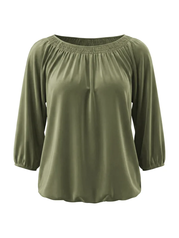Design: Raglanmouwen; Materiaal: Jersey; Halstype: Ronde hals; Motief: Effen; Details: Gedrapeerd; Extra's: Op staal naden, Voelt zacht aan; Pasvorm: Normale pasvorm; Armlengte: Driekwart mouw; Lengte: Normale lengte