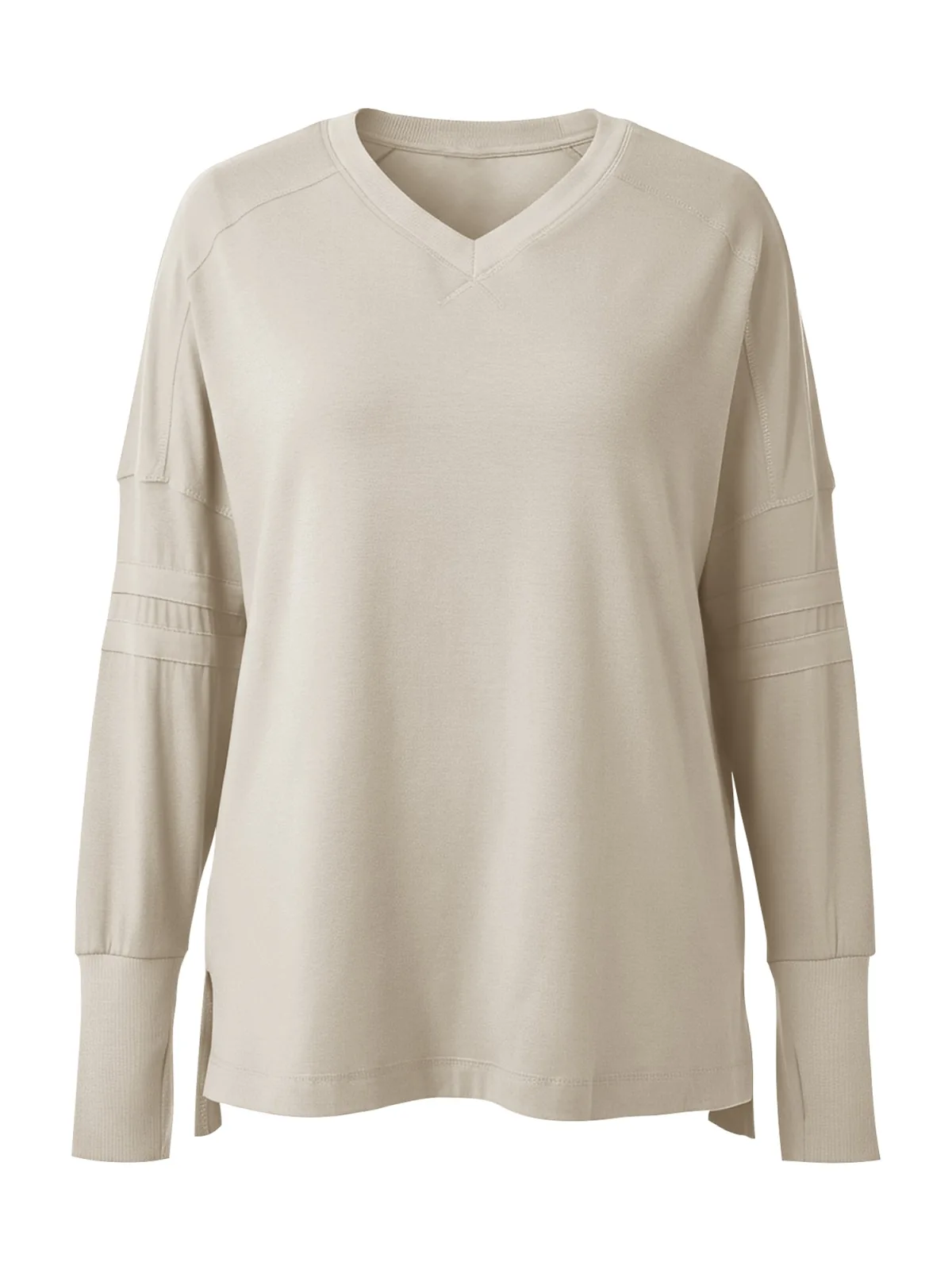 Design: Verlengd rugpand; Materiaal: Jersey; Halstype: V-hals; Motief: Effen; Extra's: Op staal naden; Pasvorm: Losse pasvorm; Armlengte: Lange mouw; Lengte: Normale lengte