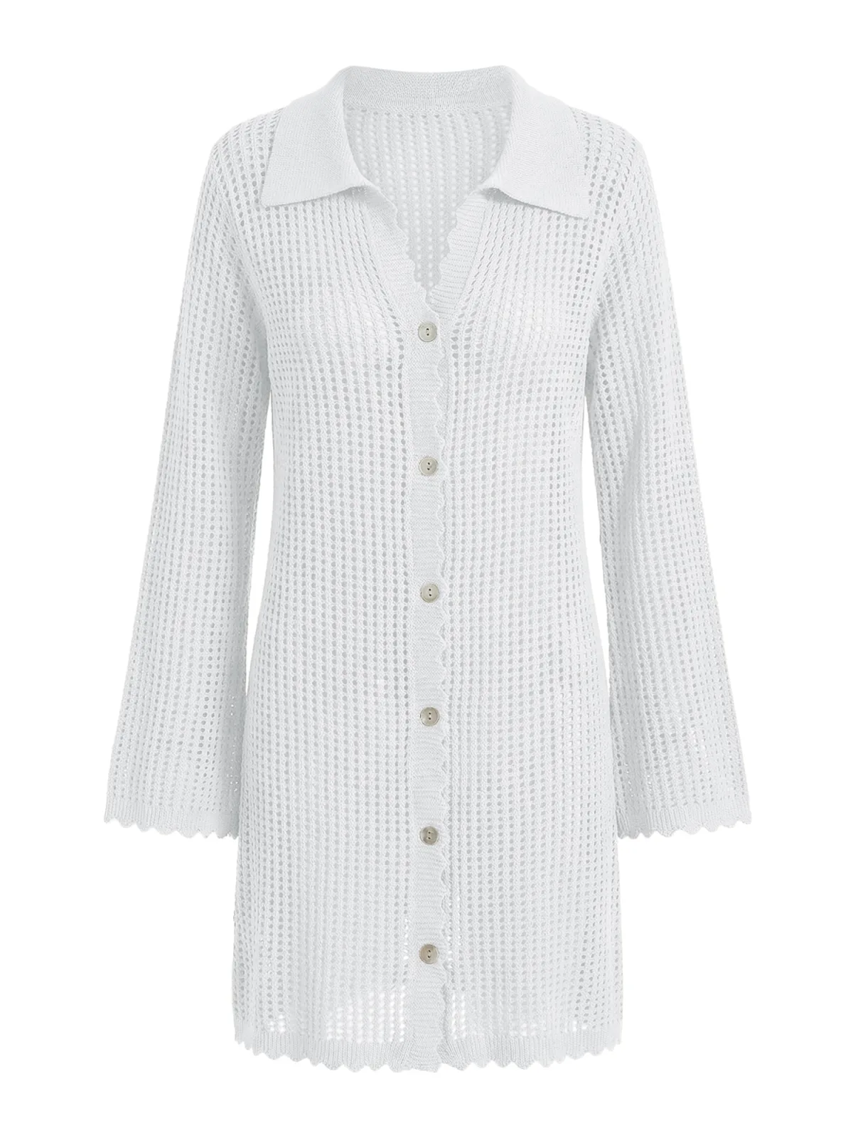 Design: Knop placket, Geribd ceintuurtje, Turn-down kraag; Type sluiting: Knoopsluiting; Materiaal: Gehaakt; Motief: Effen; Extra's: Licht transparant, Met textuur; Lengte: Kort/mini; Snit: Recht; Pasvorm: Normale pasvorm; Armlengte: Lange mouw