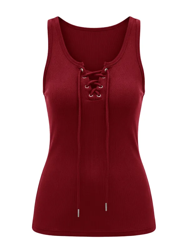 Design: Geribbelde kraag, Om te knopen/binden; Materiaal: Jersey; Halstype: Uitgesneden hals; Motief: Effen; Soort bandjes: Normale bandjes; Extra's: Op staal naden, Voelt zacht aan, Metalen oogjes; Pasvorm: Slanke pasvorm; Armlengte: Mouwloos; Lengte: Normale lengte
