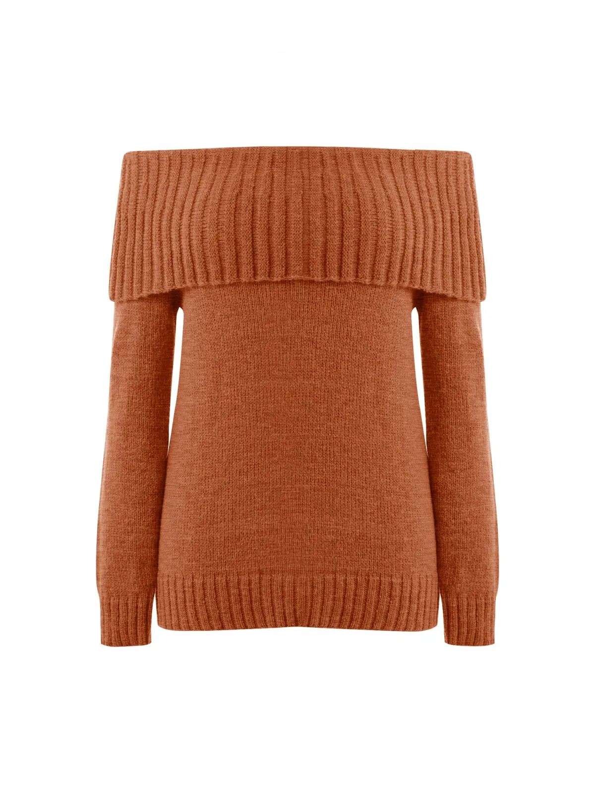 Design: Geribd ceintuurtje; Materiaal: Knitwear; Halstype: Carmen hals; Motief: Effen; Extra's: Fully fashioned; Pasvorm: Normale pasvorm; Armlengte: Lange mouw; Lengte: Normale lengte