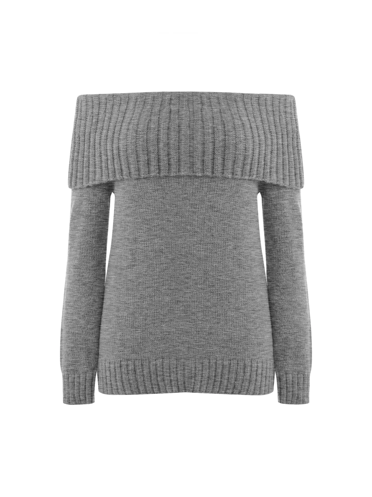 Design: Geribd ceintuurtje; Materiaal: Knitwear; Halstype: Carmen hals; Motief: Mélange; Extra's: Fully fashioned; Pasvorm: Normale pasvorm; Armlengte: Lange mouw; Lengte: Normale lengte