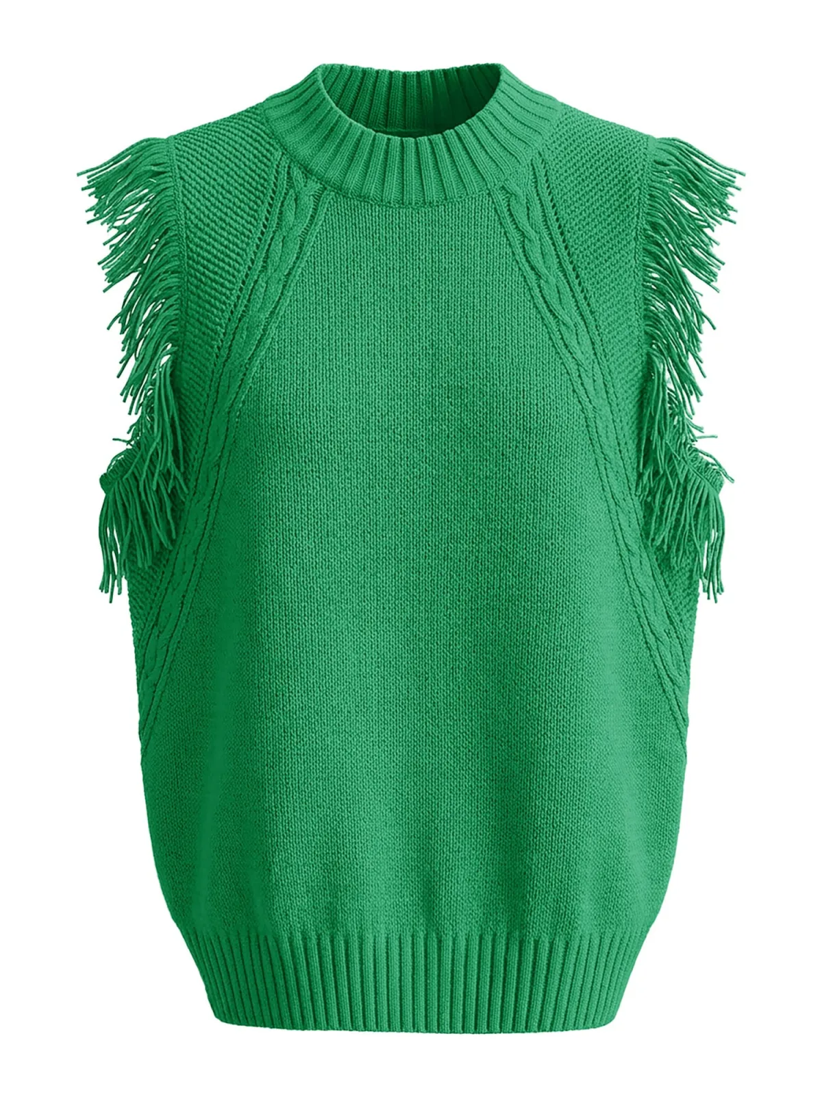 Design: Geribbelde kraag; Materiaal: Knitwear; Halstype: Opstaande kraag; Motief: Effen; Details: Franjes; Extra's: Fully fashioned; Pasvorm: Normale pasvorm; Armlengte: Mouwloos; Lengte: Normale lengte