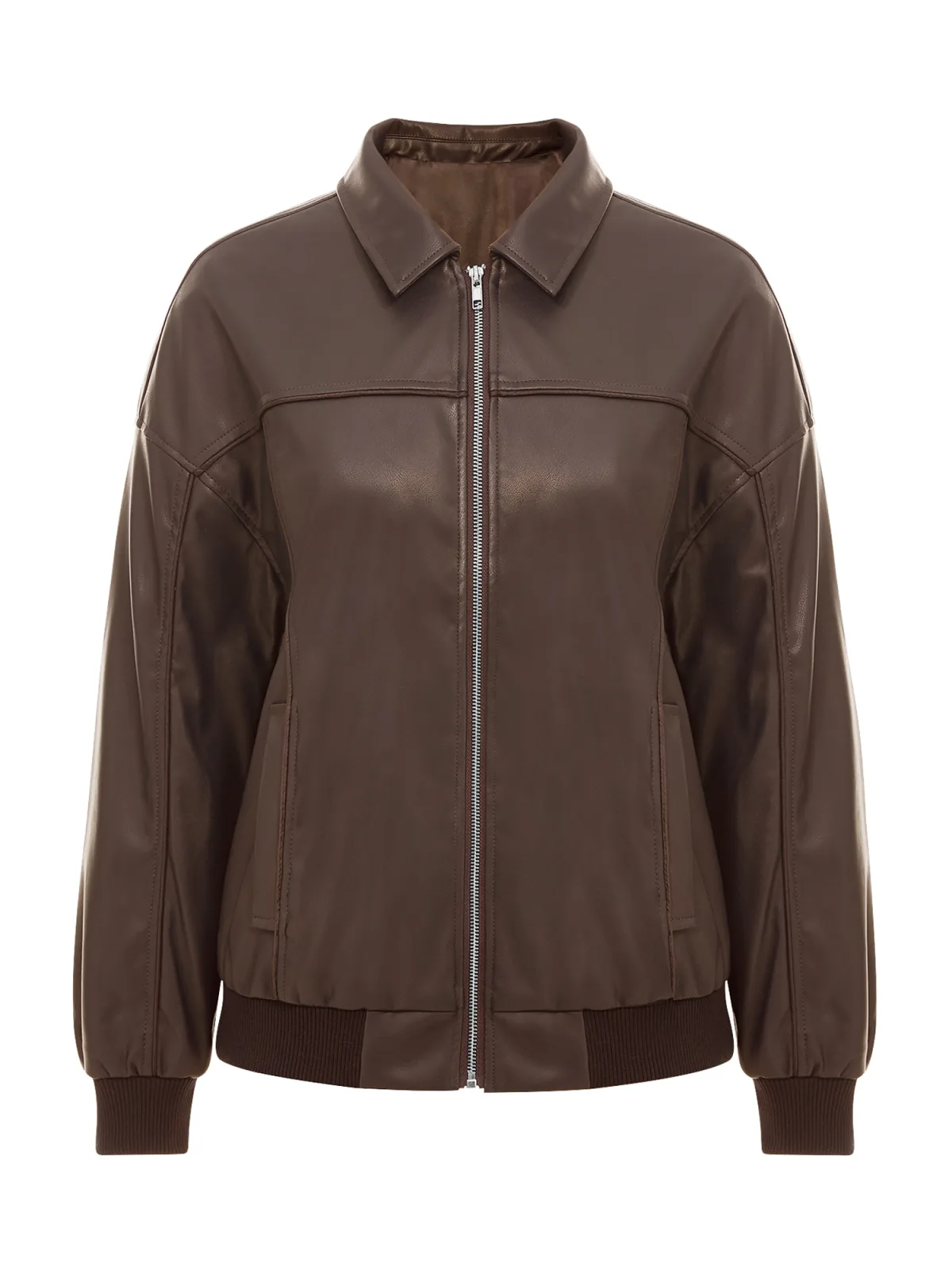 Design: Geribd ceintuurtje, Turn-down kraag; Type sluiting: Ritssluiting; Type jas: Bomberjack; Voering: Licht gevoerd; Materiaal: Imitatieleder; Motief: Effen; Extra's: Fully fashioned, Met textuur; Pasvorm: Losse pasvorm