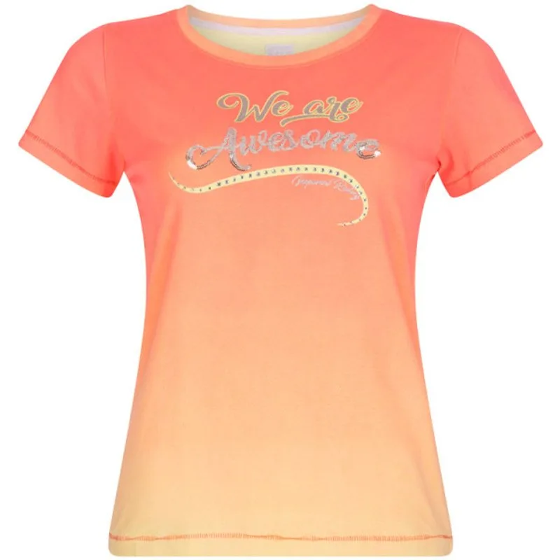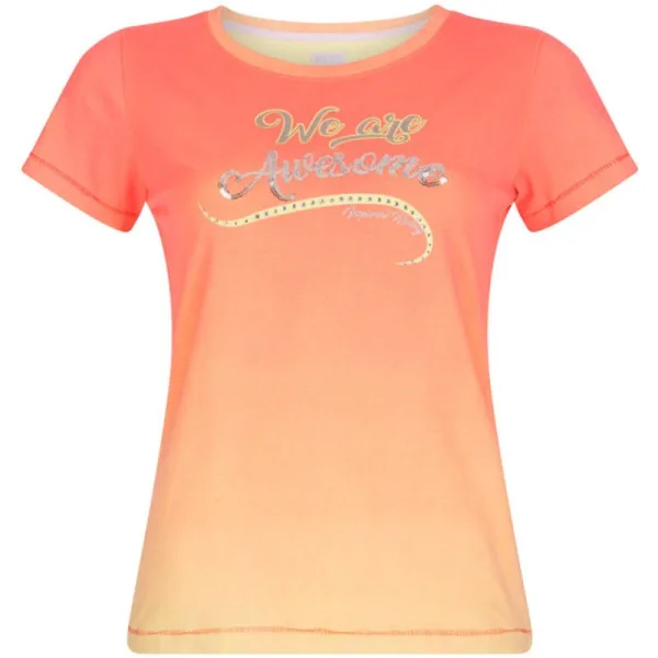 Met dit kleurrijke, vervaagde T-shirt met ronde hals zie je er fantastisch uit! De glitterprint, de pailletten en de steentjes zorgen ervoor dat je straalt!