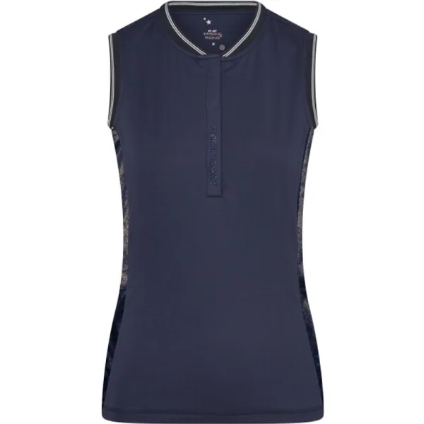 * Mouwloze tech top * Jersey met glitter en glanzende jerseymix * Ronde hals * Blinde knoopsluiting bij halslijn * Kleine opstaande geribbelde kraag met fijn lurex-streepdetail * Gevormde zoom, langer aan de achterkant * Geribbelde rand met fijn lurex-detail bij de armgaten * Logodetail met strass-steentjes bij knooppas Black: Fabric 1: 92% Polyester / 8% Elastane, Fabric 2: 80% Polyamide / 20% Elastane Navy: Fabric 1: 92 % Polyester / 8% Elastane, Fabric 2: 65% Polyamide / 35% Metallic Pearl Grey: Fabric 1: 65% Polyamide / 35% Metallic, Fabric 2: 75% Polyamide / 25% Elastane