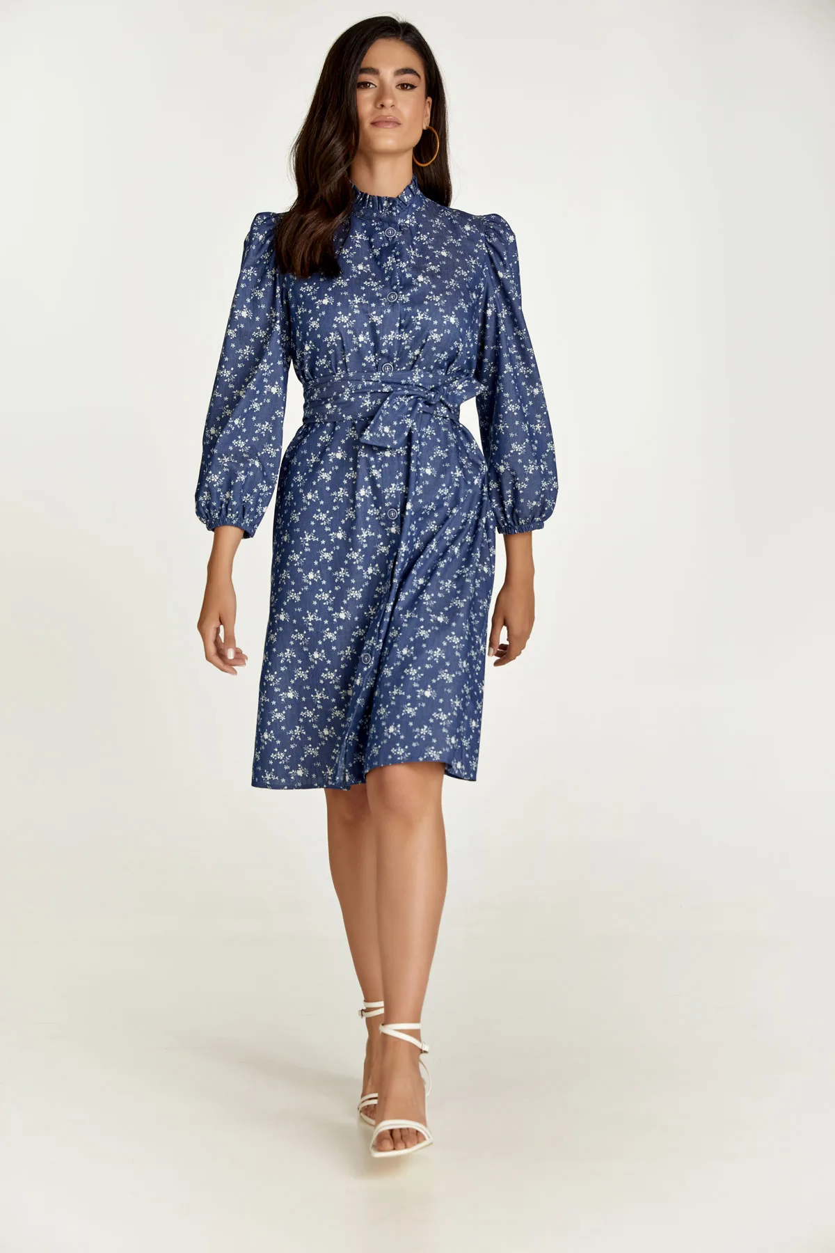 Deze indigo gebloemde jurk is gemaakt van geweven katoen in denimstijl. Het heeft lange mouwen, plooien op de schouders en elastiek aan de manchetten waardoor plooien ontstaan. Het heeft een ronde, gesloten halslijn met een opstaande kraag met ruches. De jurk heeft een sluiting aan de voorkant met tweekleurige sierknopen. De jurk kan met of zonder ceintuur worden gedragen. De ceintuur is inbegrepen.