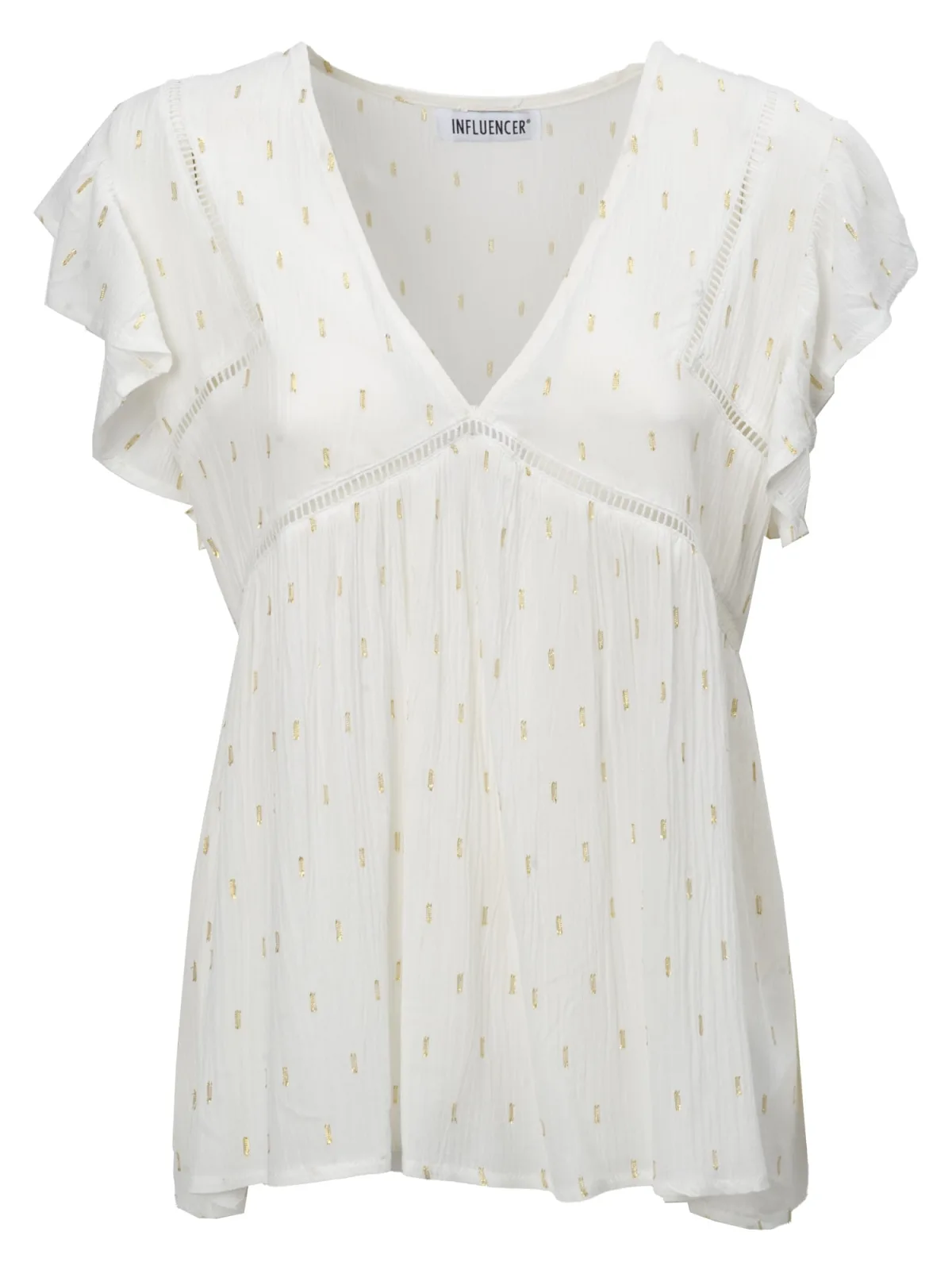 Blouse type: Blouseshirt; Design: Gevoerde zoom/rand, Rechte zoom; Type sluiting: Gesloten; Materiaal: Viscose; Kraag: Zonder kraag; Details: Ruches, Gedrapeerd; Extra's: All-over patroon, Op staal naden; Pasvorm: Losse pasvorm; Armlengte: Halve mouw; Lengte: Normale lengte