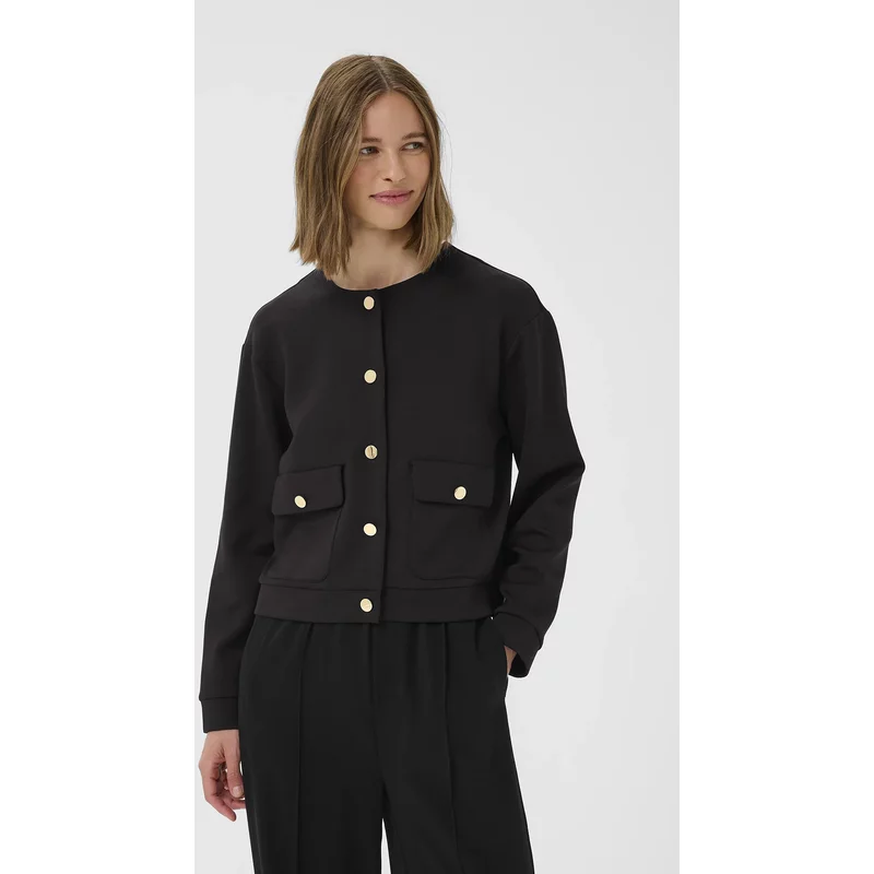 Vestjack combineert een boxy pasvorm met ronde hals en knoopsluiting. Praktische klepzakken maken het veelzijdig voor dagelijks gebruik.