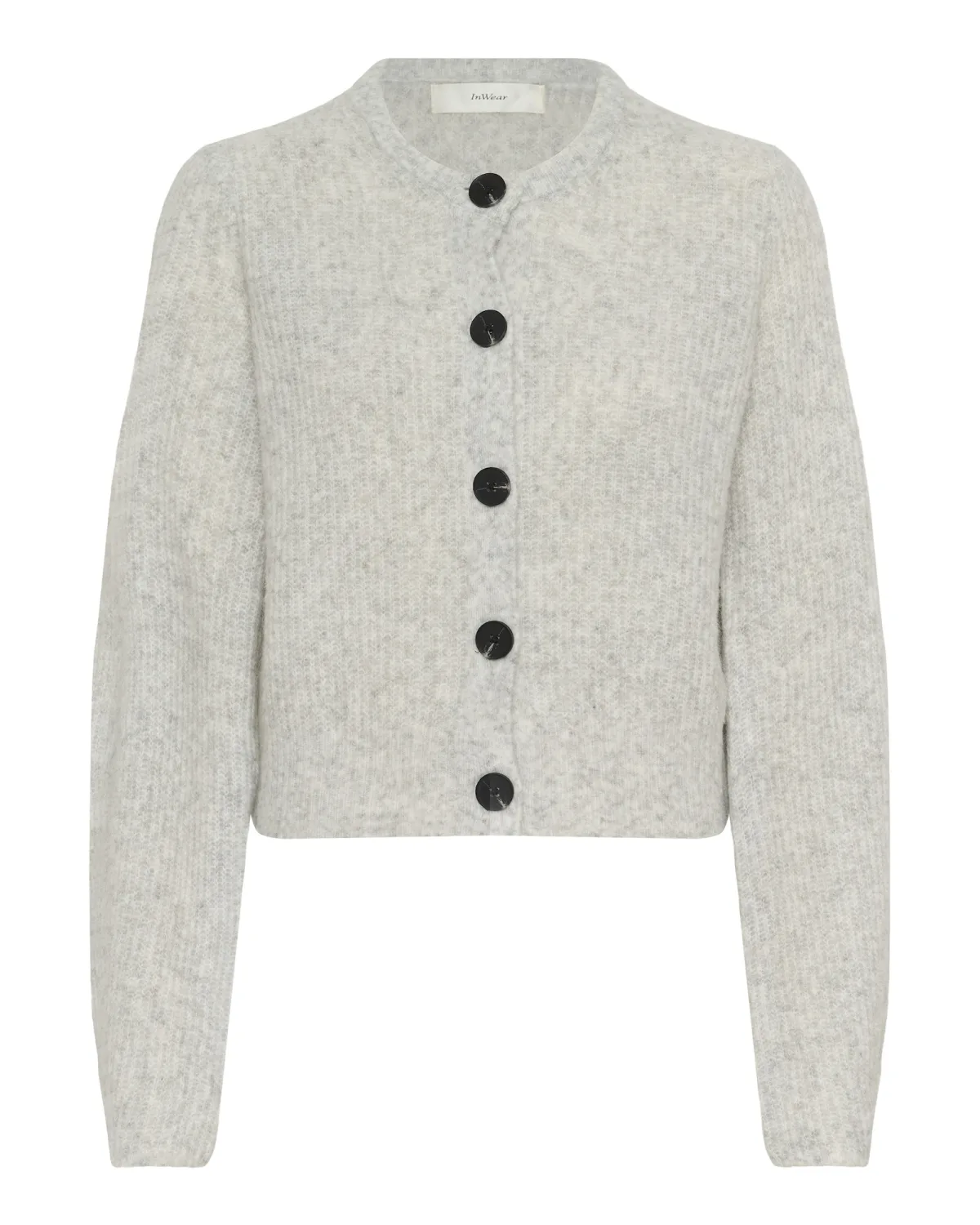 Cardigan met cropped silhouet, zachte textuur en ronde halslijn. Voorzien van vijf opvallende knopen en rechte, relaxte lange mouwen.