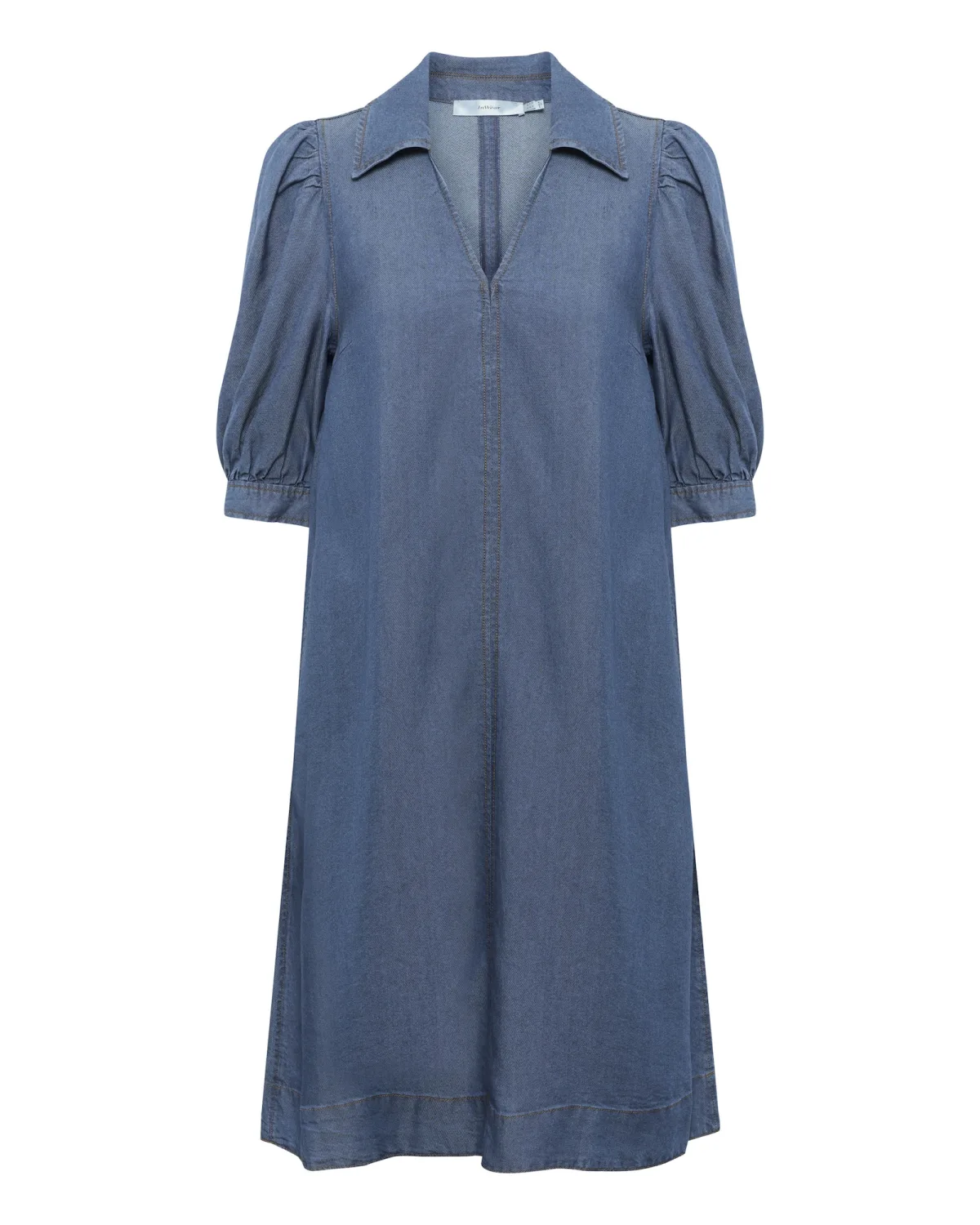 Design: Gevoerde zoom/rand; Materiaal: Denim; Motief: Effen; Details: Gedrapeerd; Extra's: Gewassen effect; Lengte: Knielengte; Snit: Uitlopend; Pasvorm: Losse pasvorm; Armlengte: Halve mouw