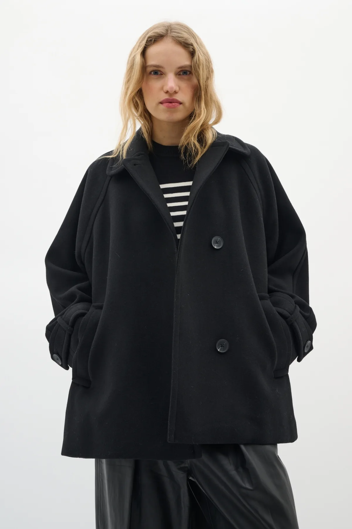 Wollen jas met een losse pasvorm, klassieke kraag en knoopsluiting. Opgerolde mouwdetails geven een tijdloze uitstraling en draagcomfort.