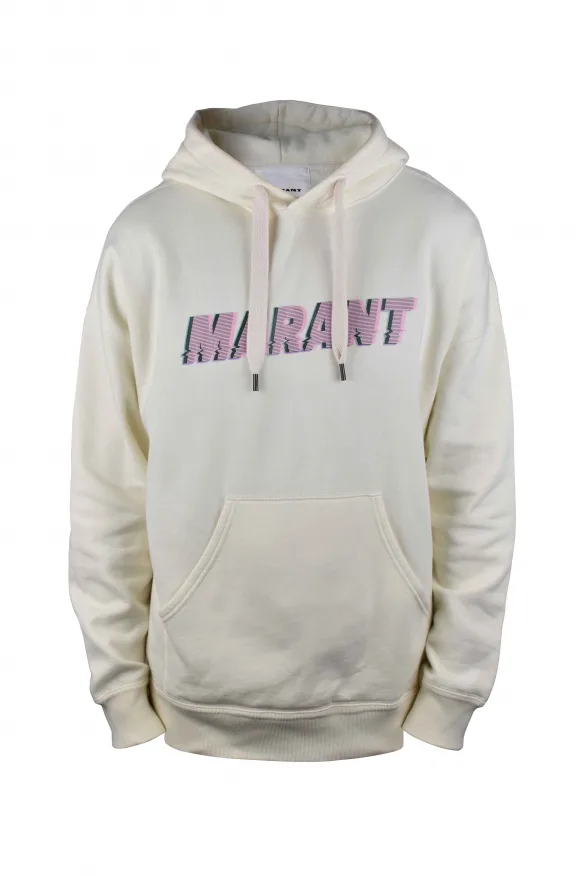 Gebroken wit katoenen sweatshirt met capuchon van Isabel Marant. Roze Marant-logo in reliëf in het midden. Geribbelde randen.Lange mouwen. Kangoeroezak.Capuchon met trekkoord.