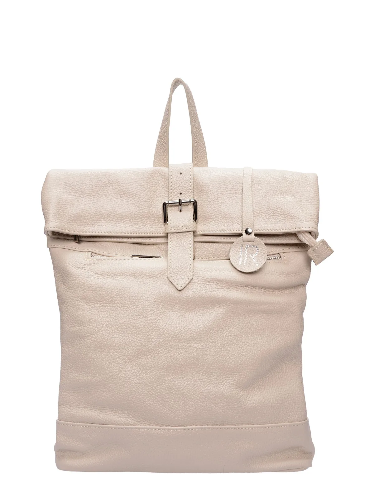 Rugzak 100% koeienleer Magnetische flap met gesp-detail en bovenste ritssluiting Voorste externe ritszak en achterste externe ritszak Stoffen voering met interne ritszak Afmetingen: 40 x 34 x 10 cm Handvat: 28 cm Verstelbare leren schouderbanden 90x2 m