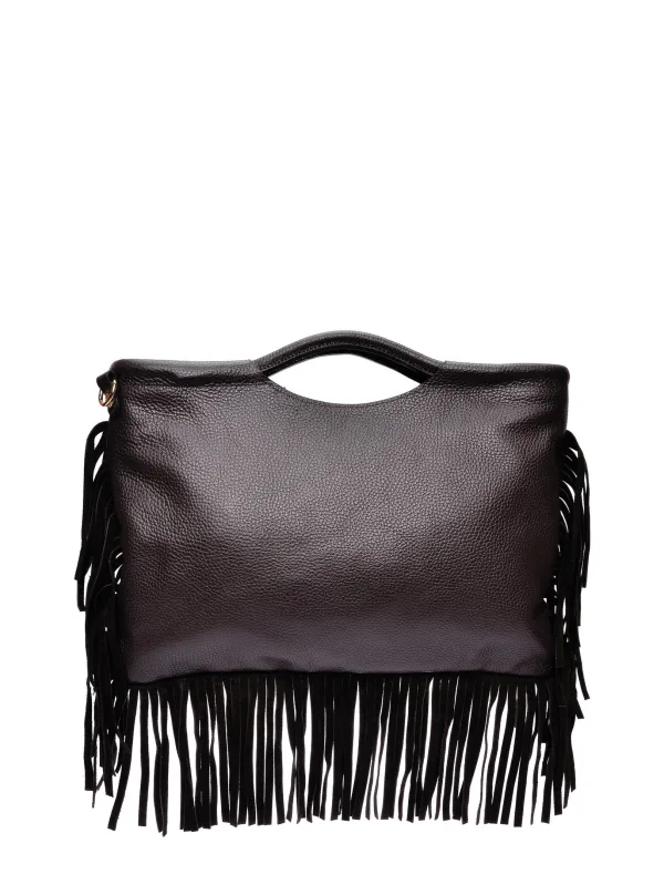Handtas 100% koeienleer Bovenste ritssluiting Voorste externe ritszak Fringe detailering aan de zijkanten en onderkant Stoffen voering met interne ritszak Afmetingen: 25 x 37 x / cm Handvat: 13,5 cm Schouderriem: 120 cm, verstelbaar en afneembaar