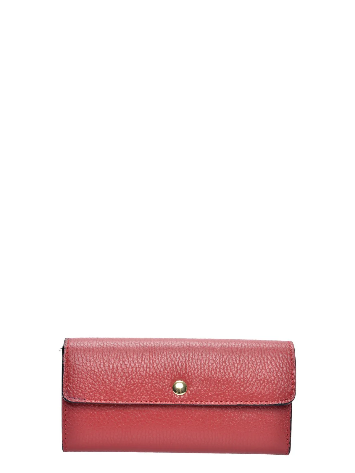 Portemonnee 100% koeienleer Klep met drukknopsluiting Meerdere kaartvakken, biljettenvakken en een interne zipmuntzak Contrasterende rode binnenbekleding Afmetingen: 8,5 x 18,5 x 3 cm
