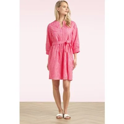 “Feeling palm-tastic today!” Deze roze a-lijn jurk is een frisse, zomerse must-have! Ze heeft een losse, comfortabele fit, 3/4 wijde pofmouwen en functionele knopen aan de voorzijde. De geborduurde palmbomen geven haar een speelse tropical twist en doordat ze is uitgevoerd in 100% katoen, draagt ze heerlijk luchtig en ademend. * V-hals * Knopenreeks * Gevoerd * 3/4, wijde pofmouwen * Afneembaar striklint, voor een extra 'snatched' taille * Valt bij een lengte van 1,70 m boven de knie