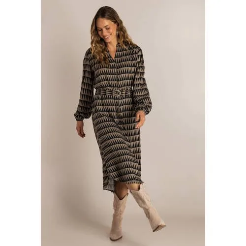 Deze lange Ivy Beau blousejurk combineert een pasvorm met een moderne all over print in bruintinten. De jurk heeft een ontwerp dat zowel geschikt is voor een werkdag als voor een etentje. De V-hals en doorknoopsluiting geven een open en luchtige uitstraling, terwijl de lange rechte mouwen zorgen voor extra bedekking. Met de bijpassende ceintuur bepaal je zelf hoe benadrukt je taille is.Details die het verschil maken Gemaakt van viscose, een soepele stof die zacht aanvoelt en soepel om het lichaam valt Lange rechte mouwen voor een rustige uitstraling V-hals met knoopsluiting over de hele lengte voor een blouse-effect All over print in bruine tinten die makkelijk te combineren is met basic items Ceintuur in de taille om de pasvorm naar wens te stylen Lange lengte, valt richting midi tot lang afhankelijk van je lengte Zonder zakken voor een gestroomlijnd silhouetVan werkdag tot weekendDeze blousejurk leent zich goed voor verschillende momenten op de dag. Met laarzen of nette schoenen is de jurk geschikt voor kantoor of een afspraak. In het weekend combineer je de jurk eenvoudig met sneakers voor een meer ontspannen uitstraling.De stijlvisie van Ivy BeauIvy Beau ontwerpt kleding die inspeelt op trends, maar tegelijk makkelijk te dragen is in het dagelijks leven. Heldere lijnen, vrouwelijke details en draagbare prints staan centraal. Zo ontstaat kleding waarin je je vrij kunt bewegen en die je garderobe langdurig aanvult.Een jurk die je eenvoudig aanpast aan jouw dag, seizoen en stijl.