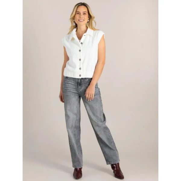 Dit mouwloze vestje heeft een opvallende structuur met een subtiel reliëf in de stof. De grote knopen aan de voorkant geven het model karakter. Dankzij de elastische boord valt het vestje mooi aangesloten en krijgt het een licht blousend effect. Materiaal: 90% Polyester, 10% Polyamide Patroon Effen Elastische boord Mouwloos