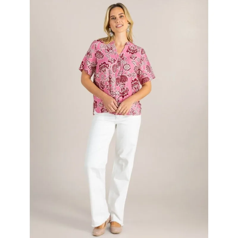 Zacht roze met krachtige bloemen – deze blouse springt meteen in het oog. De soepele viscosemix valt mooi en voelt licht aan, terwijl de striklinten bij de hals zorgen voor een charmant detail. Perfect om je outfit een frisse boost te geven. Materiaal: 83% Viscose, 17% Polyamide Patroon: Bloem Korte mouw