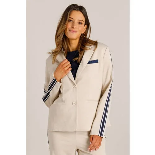Een blazer met karakter! De sand melange tint krijgt een frisse upgrade door de contrasterende streep langs de mouwen. Dankzij de lichte voering draagt hij heerlijk soepel. Combineer met de bijpassende broek voor een eigentijdse, effortless co-ord set. Materiaal: 70% Polyester, 25% Viscose, 5% Elastaan. Blazer is gevoerd. 100% viscose. Pasvorm: Regular Fit lengte: 65 cm.