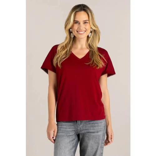 Deze donkerrode dames top van Ivy Beau is een praktische basis voor elke dag, met net wat extra door de subtiele broderie details. De effen kleur maakt het een makkelijk te combineren item, terwijl de diepe V-hals en korte rechte mouwen zorgen voor een open halslijn en een luchtig gevoel. De zachte, soepele stof voelt prettig aan op de huid en beweegt soepel met je mee.Verfijnde details voor elke dag Gemaakt van modal en katoen met elastaan voor een zacht gevoel en lichte stretch Donkerrode effen kleur die goed combineert met denim, zwart en neutrale tinten V-hals die de halslijn mooi vrij laat zonder te diep te vallen Korte, rechte mouwen voor een luchtig gevoel op warme dagen Broderie details geven de top een speelse, zomerse uitstraling Zonder sluiting, je trekt de top eenvoudig over het hoofd aan Wasbaar op 30 graden, praktisch in onderhoudIdeaal voor jouw daily outfitsDeze top uit de 'Daily' collectie is gemaakt voor alledaagse momenten. Combineer met een jeans en sneakers voor een ontspannen dag, of draag de top met een rok en sandalen voor een meer geklede zomeroutfit. De soepele stof en aangesloten maar niet strakke pasvorm maken het een geschikt item voor lange dagen.Ivy Beau stijlIvy Beau biedt kleding die goed past in een druk dagelijks leven. De collecties zijn ontworpen met oog voor draagbaarheid, moderne details en fijne materialen, zodat je eenvoudig outfits samenstelt waar je elke dag mee vooruit kunt.Een rustige basic die je garderobe eenvoudig compleet maakt.