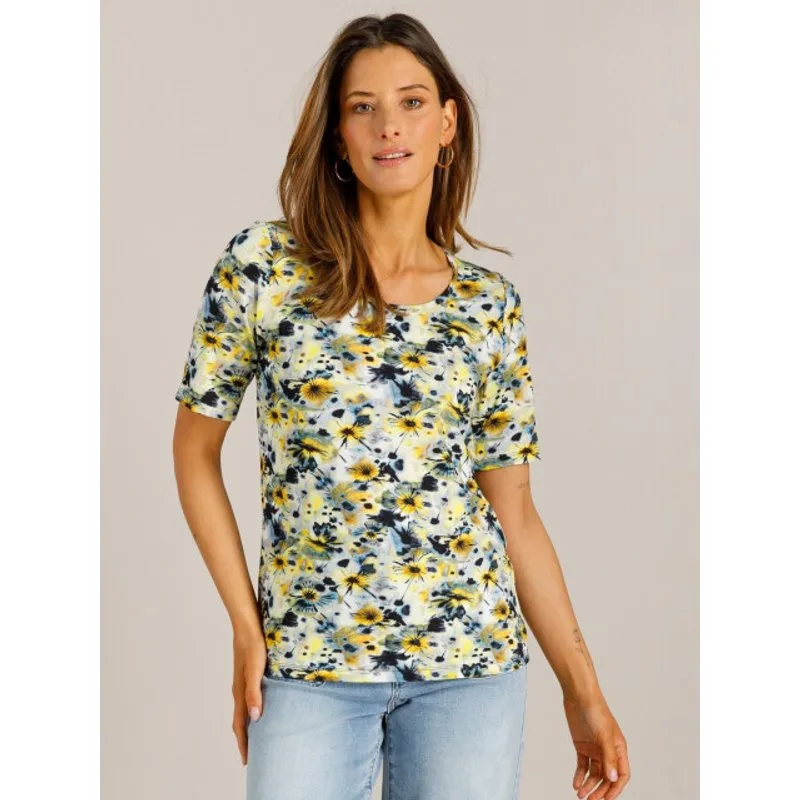 Zacht, vrolijk en heerlijk draagbaar. De Valina T-shirt valt soepel dankzij de fijne viscose jersey en krijgt extra charme door het lieve bloemenprintje. Een frisse toevoeging aan je voorjaarsgarderobe die moeiteloos combineert. Materiaal: 96% viscosde 4% elastaan. Pasvorm Regular Fit. Lengte 60,5 cm.