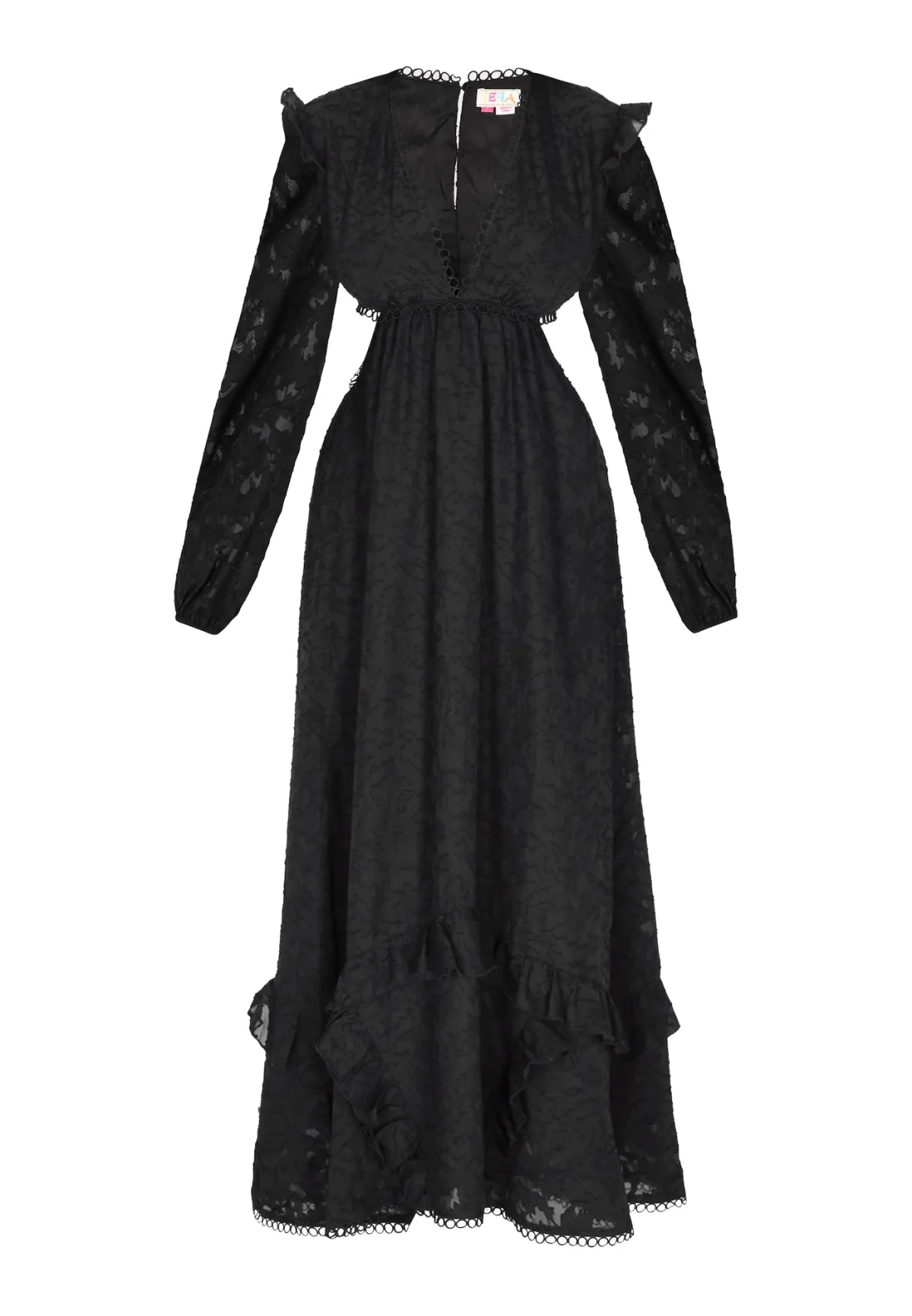 Design: Elastische taille/zoom, Knop placket, Diepe snit/decolleté; Type sluiting: Ritssluiting; Materiaal: Chiffon; Halstype: V-hals; Motief: Effen; Details: Cut-outs, Ruches, Kant, Volant; Extra’s: Applicaties; Lengte: Lang/maxi; Snit: Getailleerd; Pasvorm: Normale pasvorm; Armlengte: Lange mouw