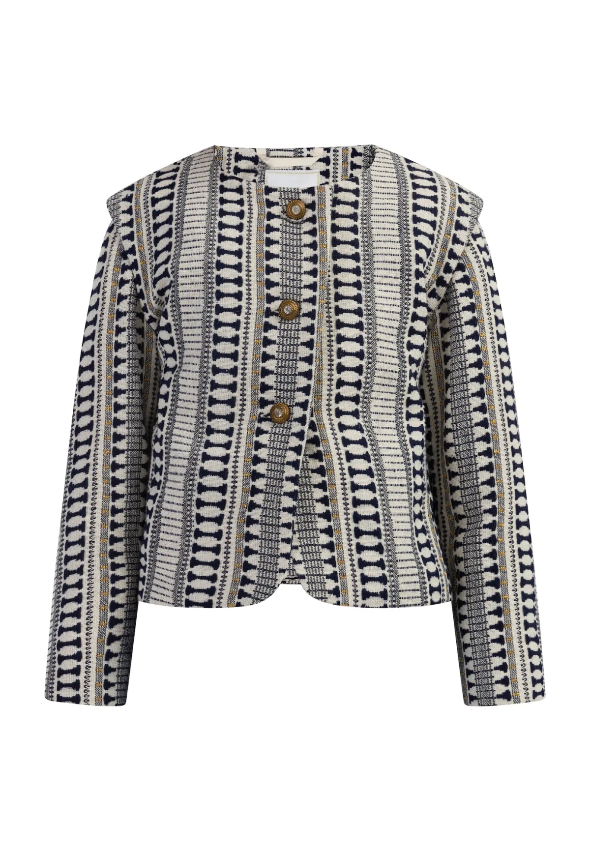 Dag, dag winterjas! Met de korte etnische jasjes van IZIA kun je je garderobe eindelijk een beetje opfrissen. Bij een torero-snit zijn de zwart-witte strepen van geweven katoenmixgarens een echte blikvanger. Het trendy jasje wordt gecompleteerd door de goudkleurige metallic draden en de mooie knopen, die in het midden versierd zijn met een strasssteentje. Kort blazerjack