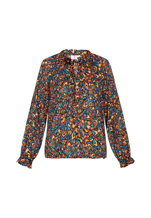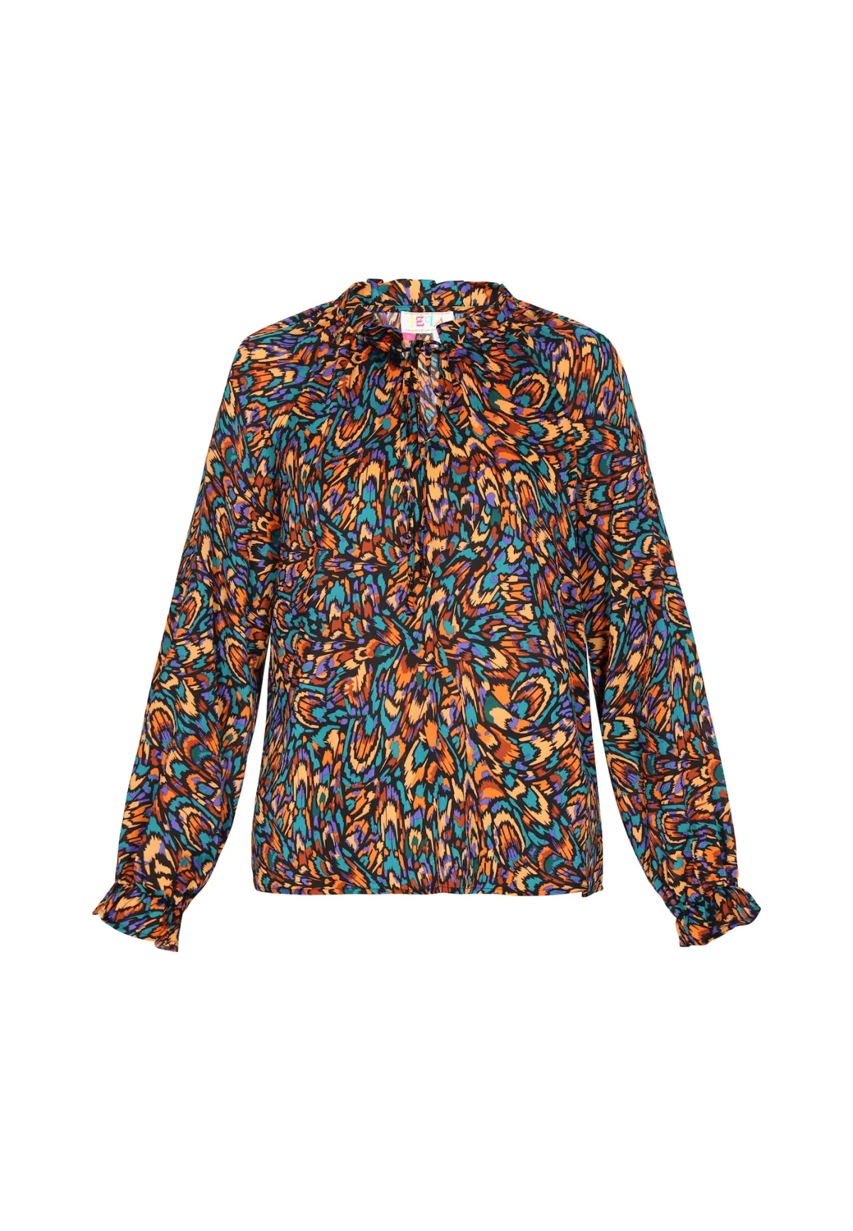 Blouse type: Wijde blouse; Design: Elastische taille/zoom, Keyholesluiting, Elastische inserts; Type sluiting: Slip; Materiaal: Chiffon; Kraag: Tuniek kraag; Details: Ruches, Gedrapeerd; Extra's: All-over patroon, Op staal naden; Pasvorm: Normale pasvorm; Armlengte: Lange mouw; Lengte: Normale lengte
