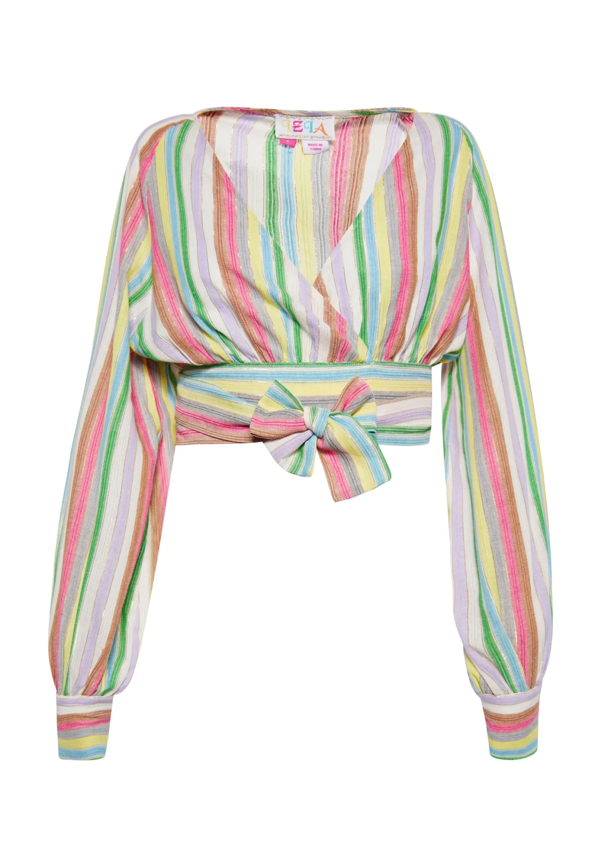 Deze gewikkelde designblouse is een levendige en stijlvolle top met kleurrijke strepen en perfect voor een zomerse look. Het heeft lange mouwen met manchetten en een diepe V-hals en straalt een etno-chique sfeer uit. Het geknoopte tailledetail geeft flair aan het cropped silhouet, waardoor het ideaal is voor verschillende gelegenheden. Omarm de casual en toch modieuze uitstraling van deze gestreepte top met ruches. Blouse