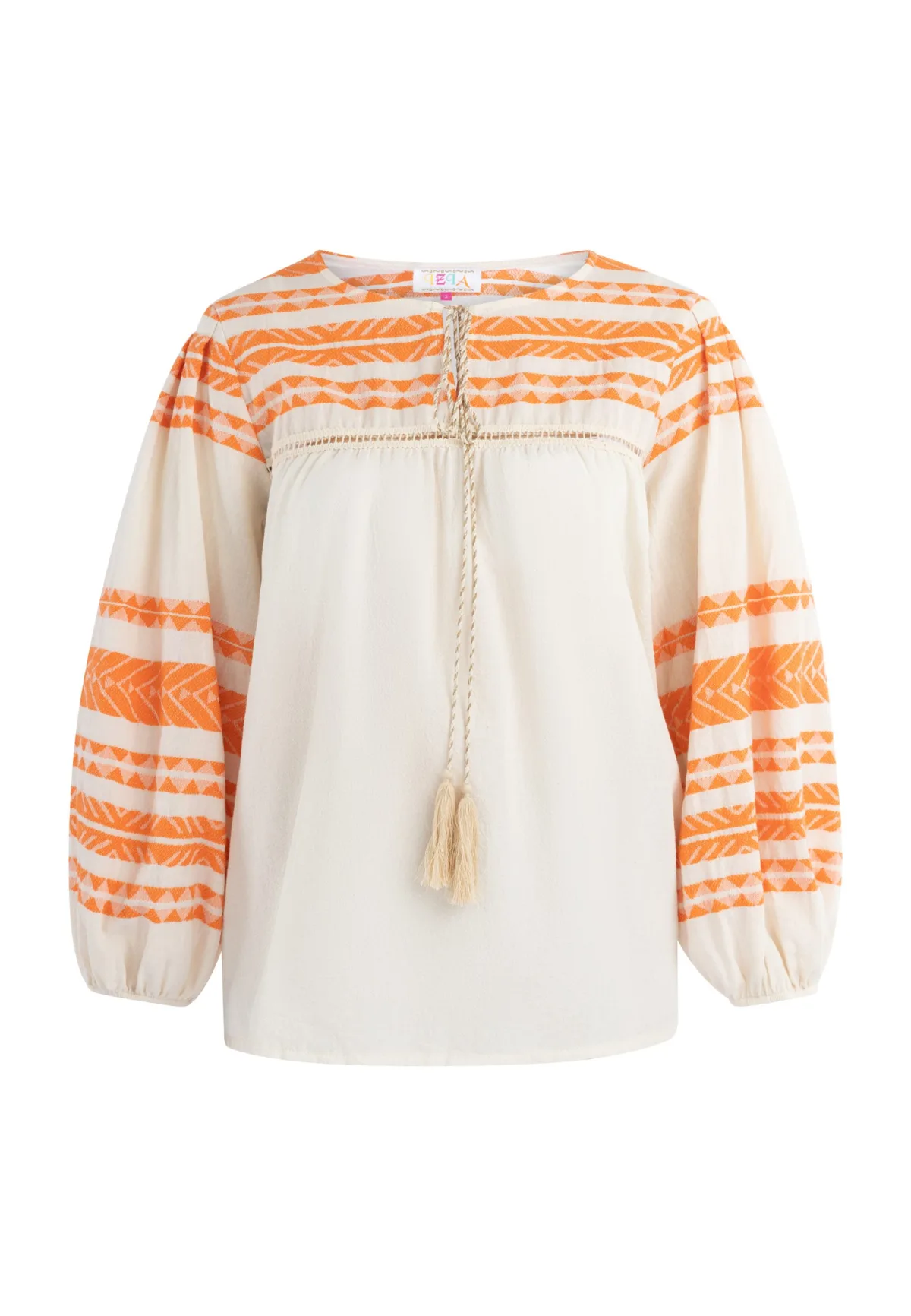 Geen voering/geen voering, geen vulling IZIA presenteert een casual boho-stijl met de blouse gemaakt in Italië. Het casual model is gemaakt van een lichte katoenmix en wordt geaccentueerd met een ingeweven etnisch patroon. De wijde mouwen, een strikband met goudkleurig draad en het oogjeskant onder de halslijn maken het geheel compleet. Blouse