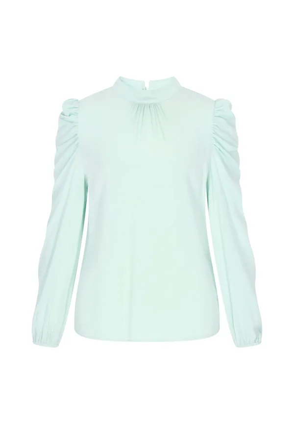 Blouse type: Blouseshirt; Design: Keyholesluiting, Pofmouwen, Elastische inzetstukken; Type sluiting: Knoopsluiting; Materiaal: Viscose; Motief: Effen; Kraag: Opstaande kraag; Details: Cut-outs, Gedrapeerd; Extra's: Op staal naden, Gladde stof; Pasvorm: Normale pasvorm; Armlengte: Lange mouw; Lengte: Normale lengte
