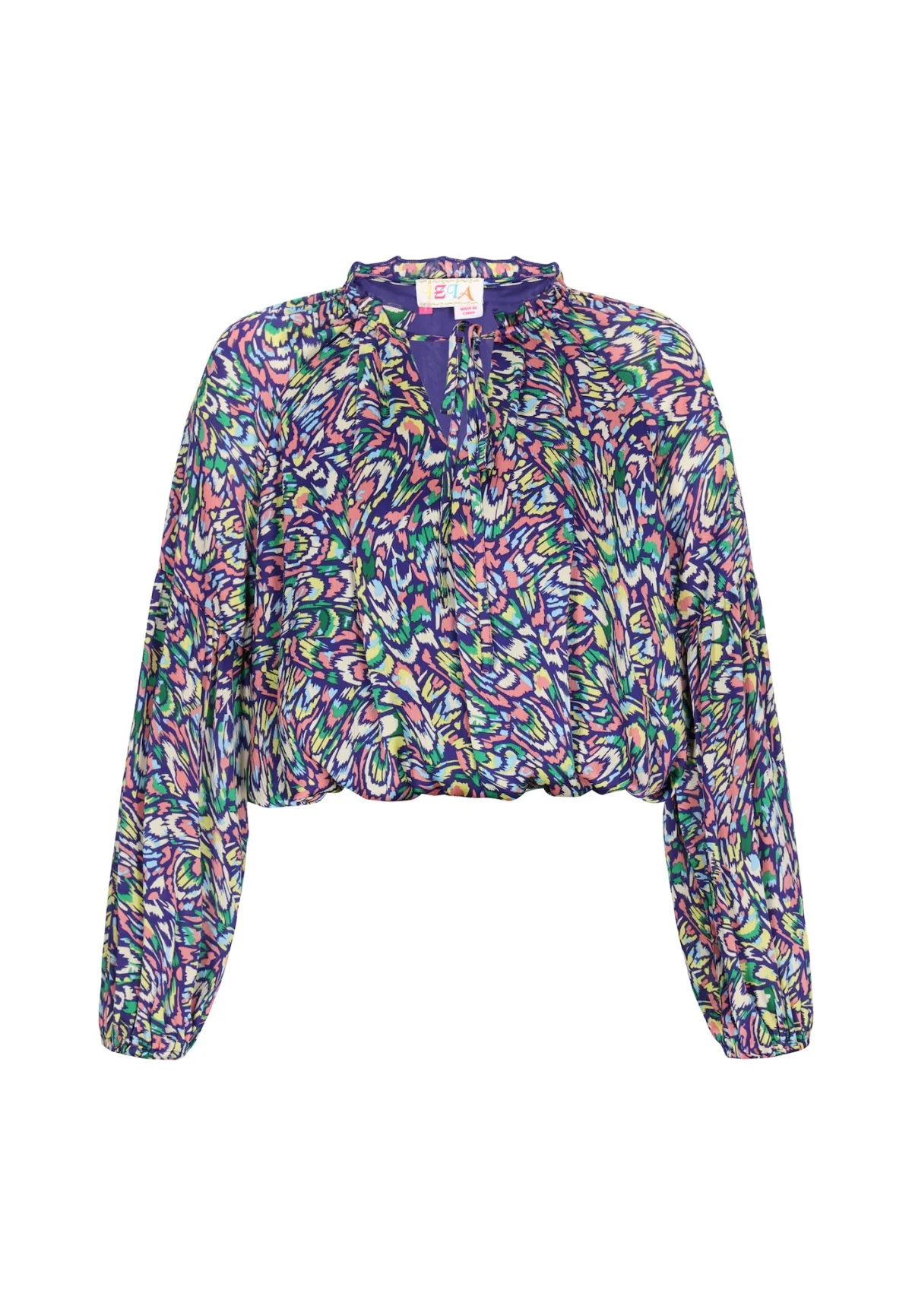 Blouse type: Wijde blouse; Design: Gevoerde zoom/rand; Type sluiting: Slip; Materiaal: Chiffon; Kraag: Tuniek kraag; Details: Ruches, Gedrapeerd; Extra's: All-over patroon; Pasvorm: Normale pasvorm; Armlengte: Lange mouw; Lengte: Korte pasvorm