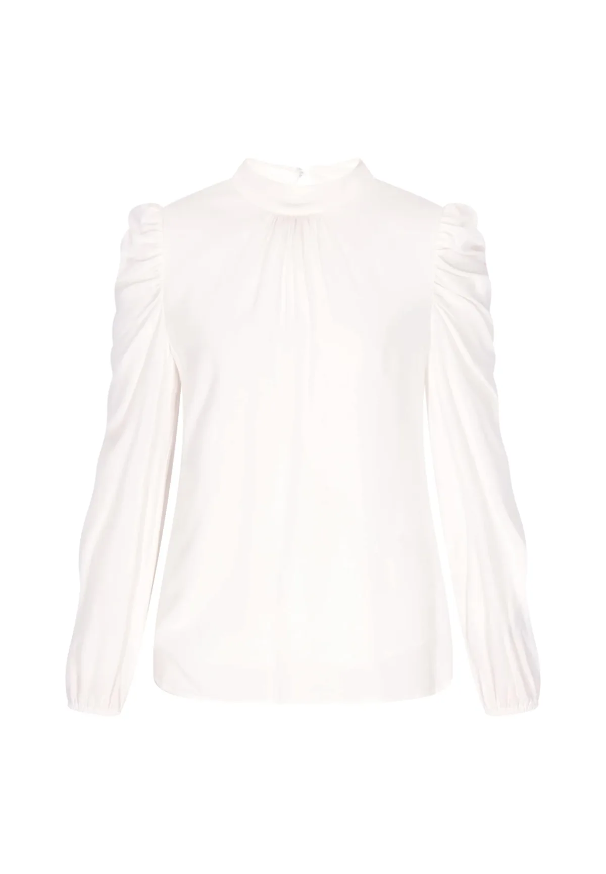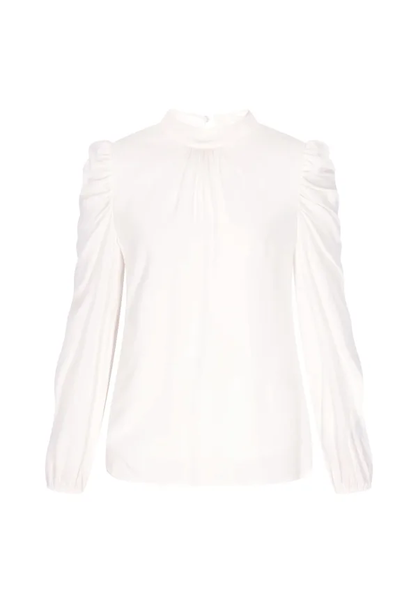 Blouse type: Blouseshirt; Design: Elastische taille/zoom; Type sluiting: Knoopsluiting; Materiaal: Viscose; Motief: Effen; Kraag: Opstaande kraag; Details: Cut-outs, Gedrapeerd; Extra's: Gladde stof; Pasvorm: Normale pasvorm; Armlengte: Lange mouw; Lengte: Normale lengte