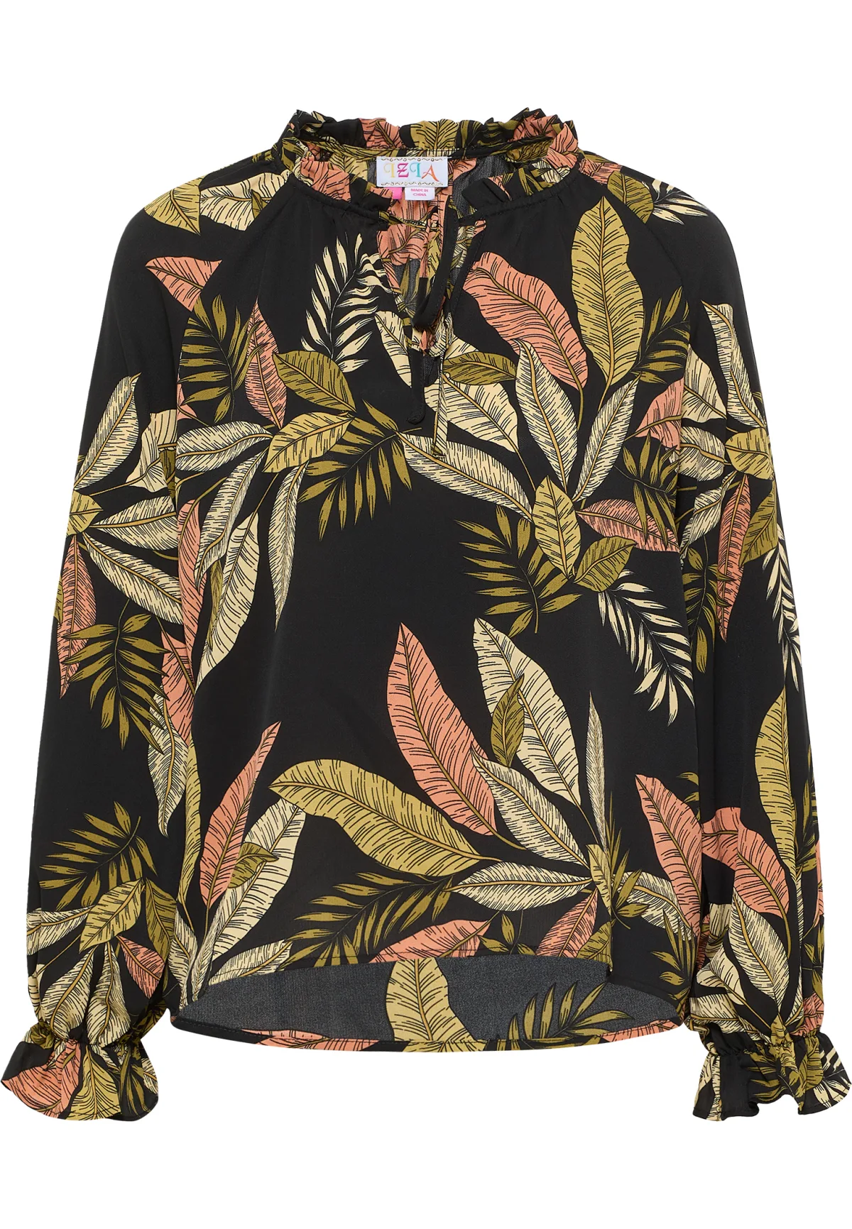De vervagende zomer wordt weerspiegeld in de kleuren van deze IZIA blouse en toch straalt de print van bladeren een warm, zonnig gevoel uit. Het zachte, vloeiende materiaal draagt comfortabel en de kleine opstaande kraag met ruches gaat over in een V-hals met een strikbandje. De raglanmouwen eindigen in elastische manchetten met eveneens een ruche.