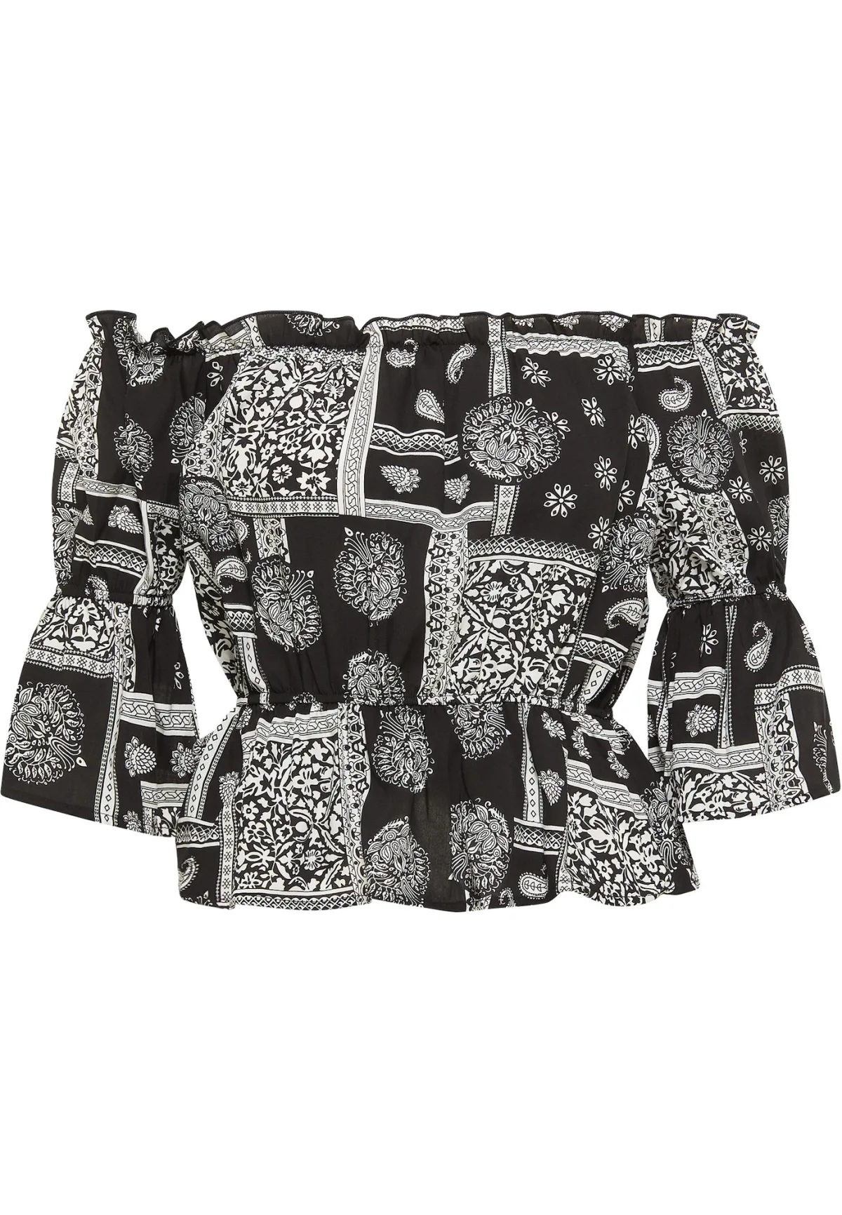 Met de bedrukte Carmen blouse van IZIA maak je van elk plekje een catwalk! De zuivere viscose voelt heel zacht aan, is luchtig en licht. Dankzij de brede halslijn met elastische tailleband kan hij off-the-shoulder gedragen worden als trendy Carmen blouse. De halflange mouwen zijn ook elastisch, waardoor een fladderige volant ontstaat die voor een romantische touch zorgt, net als de peplum. Op vakantie of in de stad, met een broek, rok of short, dit is een investering waar u elke dag plezier van zult hebben.