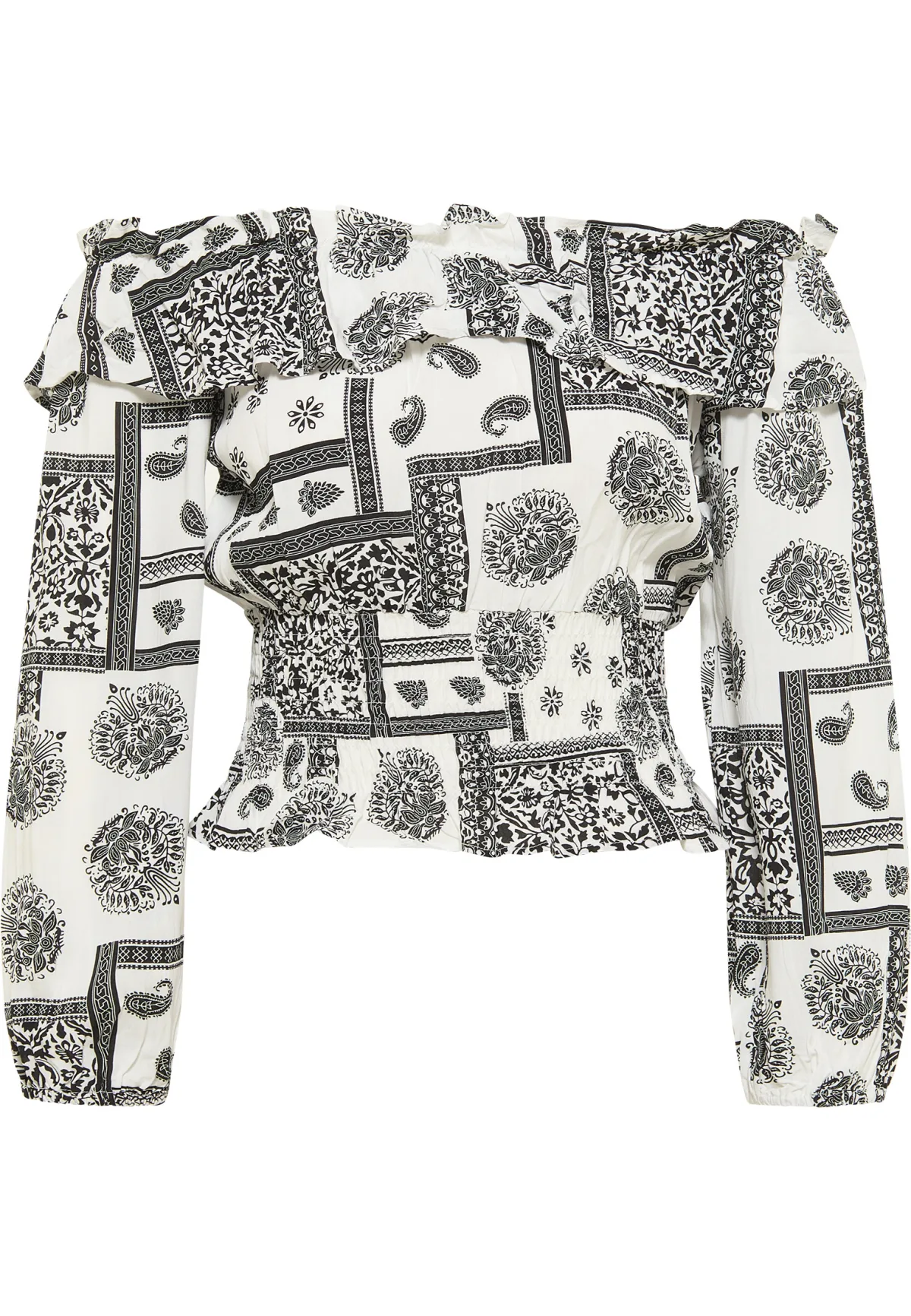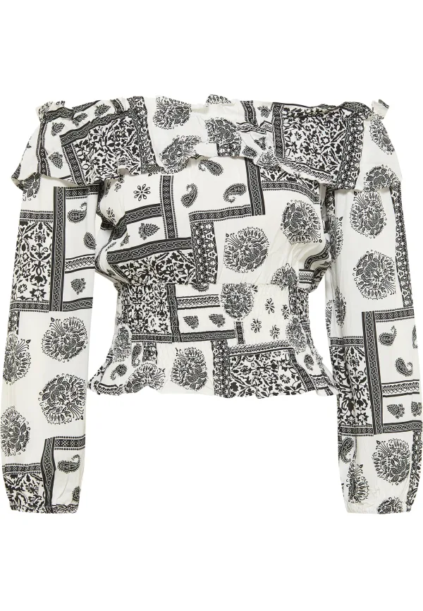 Het Carmen shirt van IZIA heeft een etnische print van paisley en bloemen en een geraffineerd off-the-shoulder design. De elastische halslijn accentueert vakkundig de schouders en is afgewerkt met een spannende volant. De vrouwelijke stijl wordt afgemaakt door de gesmokte brede zoom en de lange mouwen met elastische boorden. Cool met een korte denimshort en sneakers, vrouwelijk met een stoffen broek of rok. Een must-have voor trendsetters.