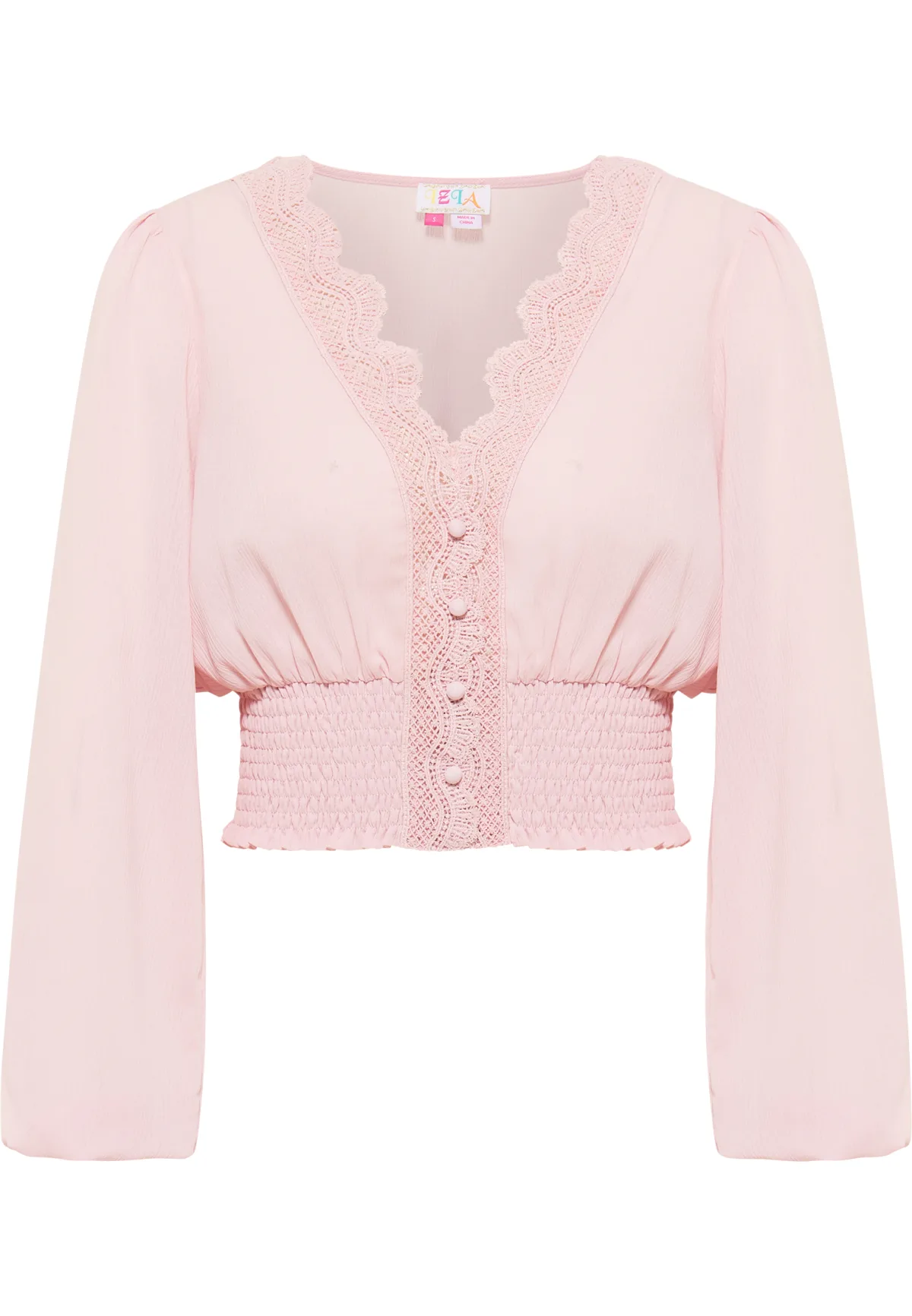De zomerse IZIA blouse in cropped stijl nodigt uit tot een sundowner aan de strandbar. Het maakt indruk met zijn brede, gesmokte manchetten en delicate kanten inzetstukken. Hij is gemaakt van licht materiaal en heeft sierknopen. De lange mouwen vinden een geslaagde afwerking in de elastische manchetten.
