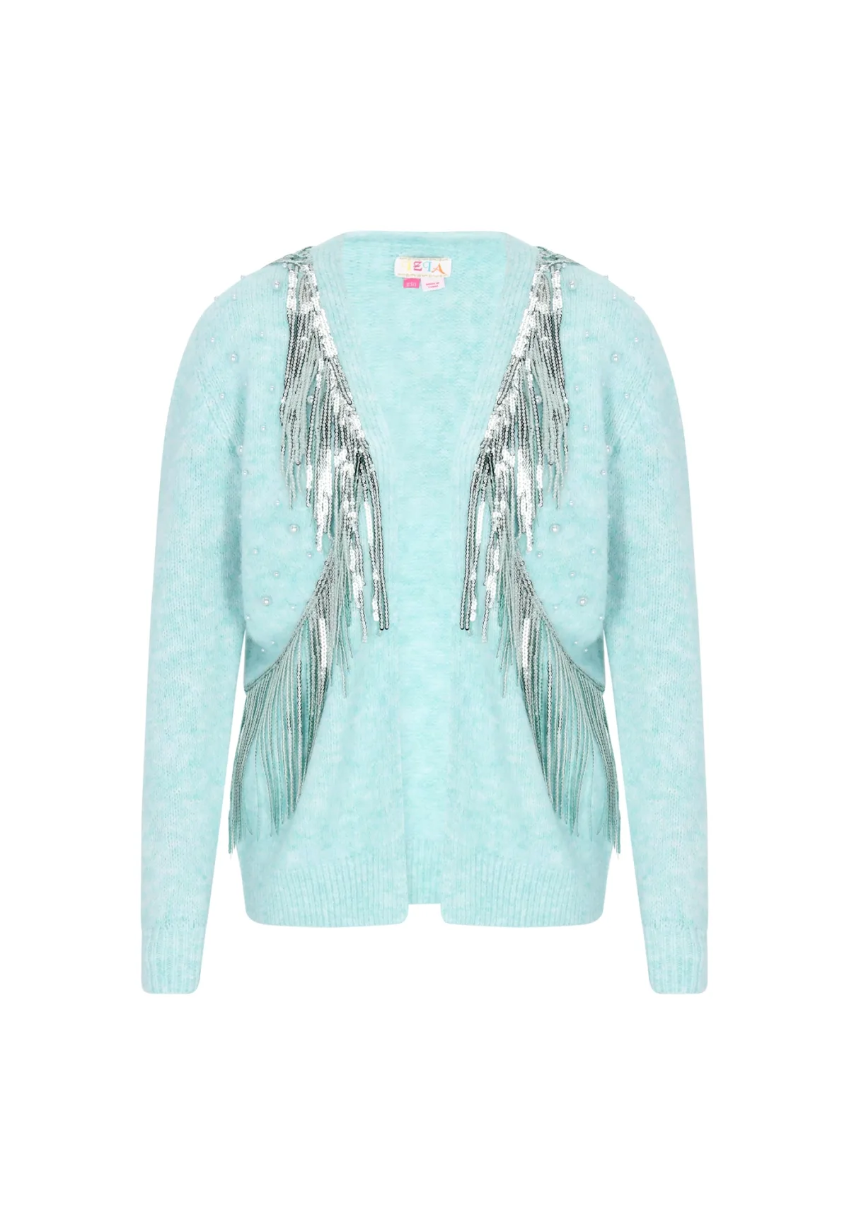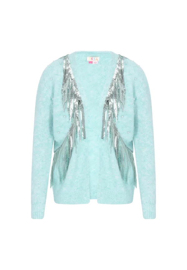 Design: Recht model, Geribd ceintuurtje, Zonder sluiting; Type sluiting: Open; Materiaal: Knitwear; Motief: Mélange; Details: Franjes, Pailletten; Extra's: Op staal naden; Pasvorm: Normale pasvorm; Armlengte: Lange mouw; Lengte: Normale lengte